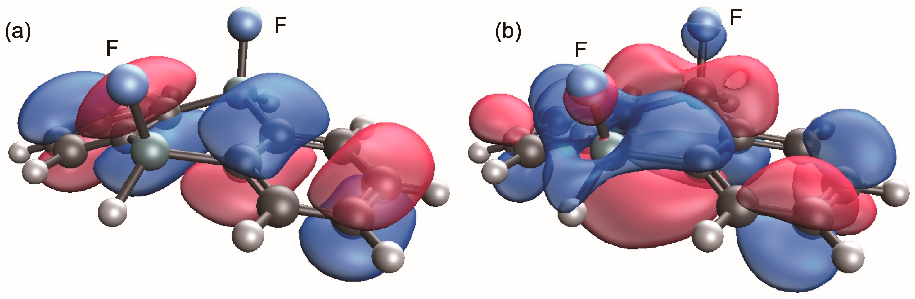 Figure 7, the frontier molecular orbitals are effectively delocalized across the 9,10-disila-9,10-dihydroanthracene skeleton, exhibiting a resemblance to those of an anthracene, which is attributed to the coupling of the low-lying Si–F σ* orbitals with the π/π* orbitals of the neighboring aromatic rings. Notably, since the LUMO of
