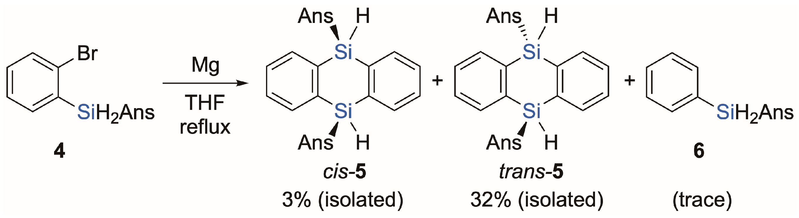 3.3. Synthesis of 9,10-Bis(p-methoxyphenyl)-9,10-disila-9,10-dihydroanthracenes (cis-5, trans-5)