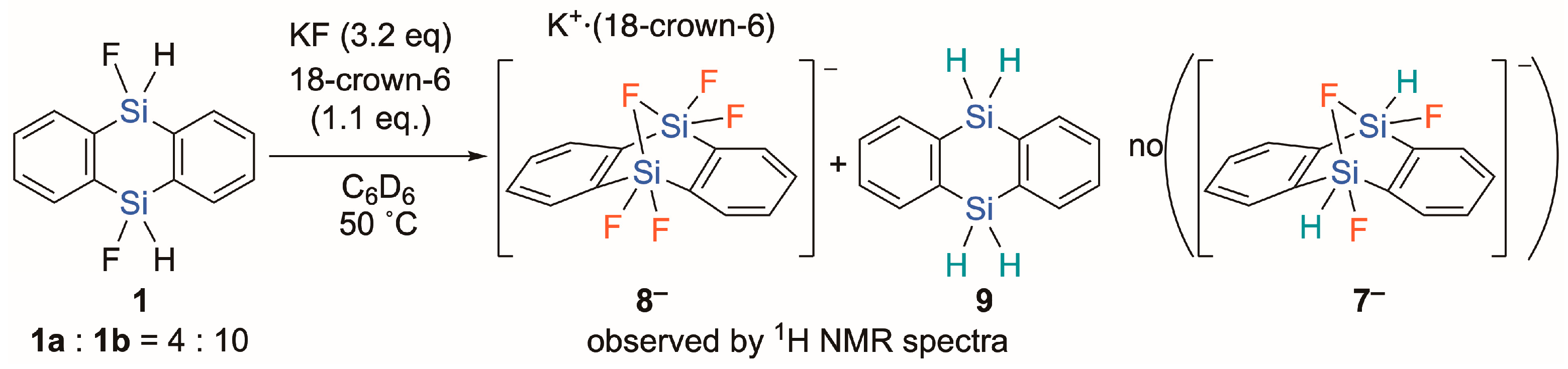 The isomeric mixture of 9,10-difluoro-9,10-disila-9,10-dihydroanthracenes 1 (189 mg, 0.0760 mmol) was dissolved in C6D6 (0.4 mL) in a J. Young. NMR tube. After adding KF (14.0 mg, 0.241 mmol) and 18-crown-6-ether (226 mg, 0.085 mmol), the solution was heated at 50 °C for 8 days. 8−: 1H NMR (400 MHz, C6D6) δ 7.12 (dd, J = 2.0, 3.3 Hz, 4H), 7.56 (dd, J = 2.0, 3.3 Hz, 4H); 13C{1H} NMR(101 MHz, C6D6) δ; 19F NMR (565 MHz, C6D6) δ −115.3 (br); 29Si{1H} NMR (119 MHz, C6D6) δ −77.7 (sextet, 1JSi-F = 128 Hz). 9: 1H NMR (400 MHz, C6D6) δ 4.99 (s, 4H), 7.23 (dd, J = 2.0, 3.3 Hz, 4H), 8.17 (dd, J = 2.0, 3.3 Hz, 4H); 13C{1H} NMR (101 MHz, C6D6) δ; 29Si{1H} NMR (119 MHz, C6D6) δ −49.0(s); 29Si NMR (119 MHz, C6D6) δ −49.0 (t, JSiH = 201 Hz).