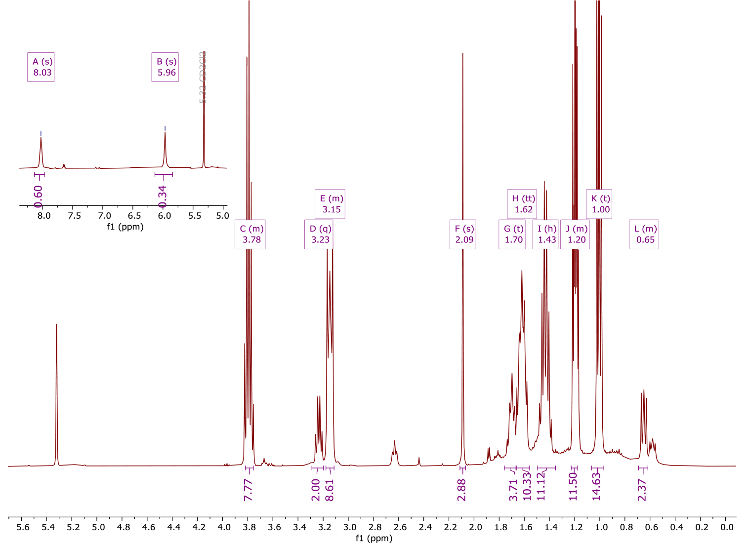 11B NMR (CD2Cl2, δ, ppm): –7.0 (s, 1B, B(1), –15.8 (d, JB–H = 130 Hz, 10B, B(2-11)), –17.2 (d, 1B, B(12)). 1H NMR (CD2Cl2, δ, ppm): 8.03 (br s, 1H, NH=C(NH)–CH3), 5.96 (br s, 1H, NH=C(NH)–CH3), 3.79 (q, J = 6.8 Hz, 6H, O-CH2-CH3), 3.23 (q, J = 6.8 Hz, 2H, NH-CH2), 3.19–3.07 (8H, TBA), 2.09 (s, 3H, NH=C(NH)–CH3), 1.70 (p, J = 7.8 Hz, 2H, CH2-CH2-CH2), 1.43 (8H, TBA), 1.19 (td, J = 7.0, 3.8 Hz, 12H, O-CH2-CH3), 1.00 (12H, TBA), 0.65 (m, 2H, CH2-Si). 13C{1H} NMR (CD2Cl2, δ, ppm): 164.3 (NH=C(NH)–CH3), 59.4 (TBA), 58.9 (O-CH2-CH3), 46.5 (NH-CH2), 24.4 (TBA), 23.8 (CH2-CH2-CH2), 20.2(TBA), 20.1 (NH=C(NH)–CH3), 18.6(O-CH2-CH3), 13.9 (TBA), 7.8 (CH2-Si).