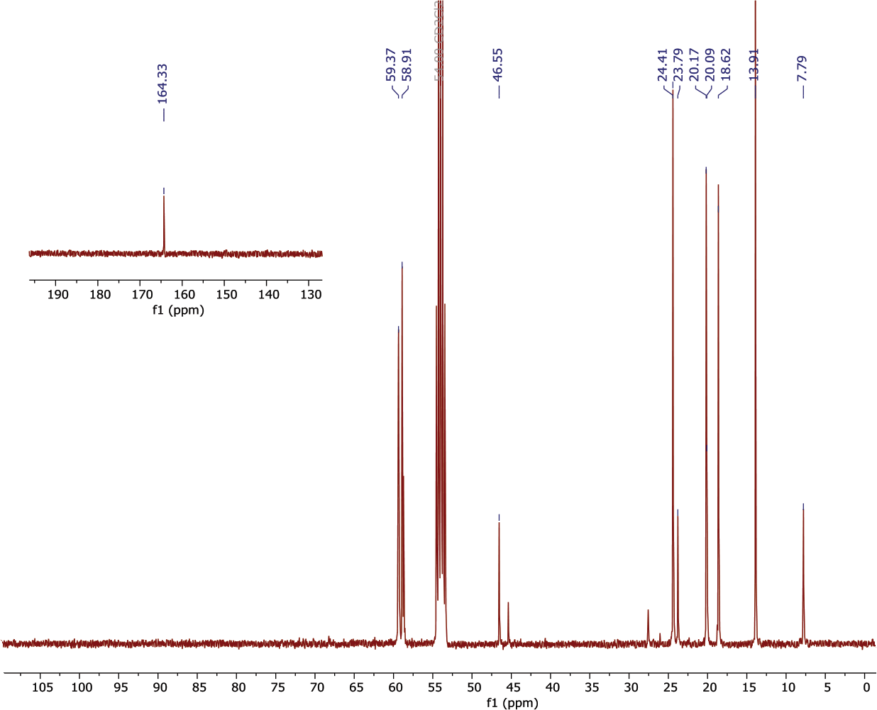 Figure 3), the amidine carbon is observed in the characteristic low-field region at 164.3 ppm. Ethoxy group signals are found at 58.9 and 18.6 ppm. The amidine methyl group appears at 20.1 ppm, while the carbon attached to silicon (C–Si) yields the most high-field signal at 7.8 ppm. The absence of additional carbonyl signals and the presence of a single set of amidine signals indicate the formation of a single isomer.
