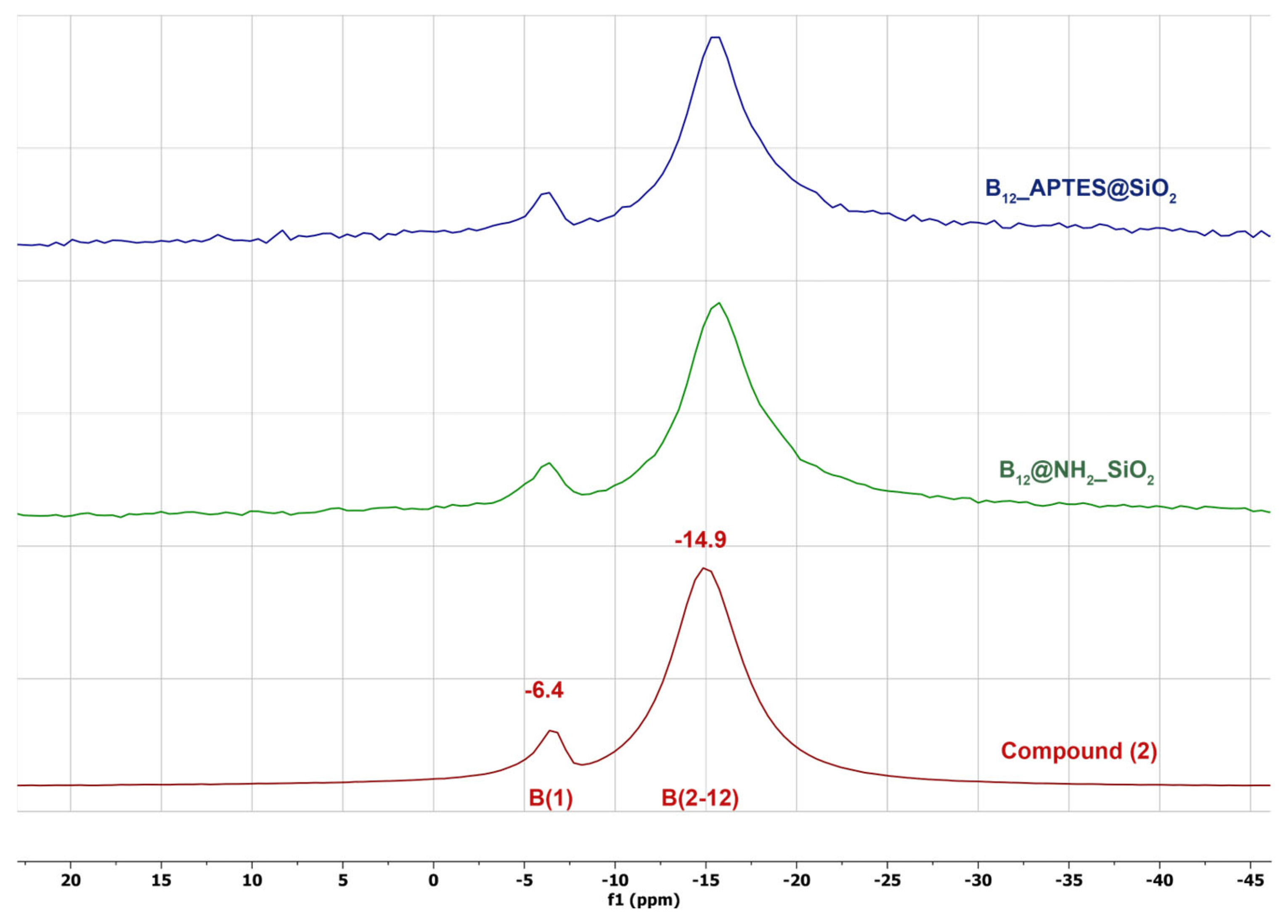 (2): the signal from the substituted boron atom appears as a distinct singlet around –6.5 ppm, while the unsubstituted boron atoms merge into a broad signal in the –15 ppm region. This confirms that the cluster integrity and amidine linkage remain intact upon immobilization.