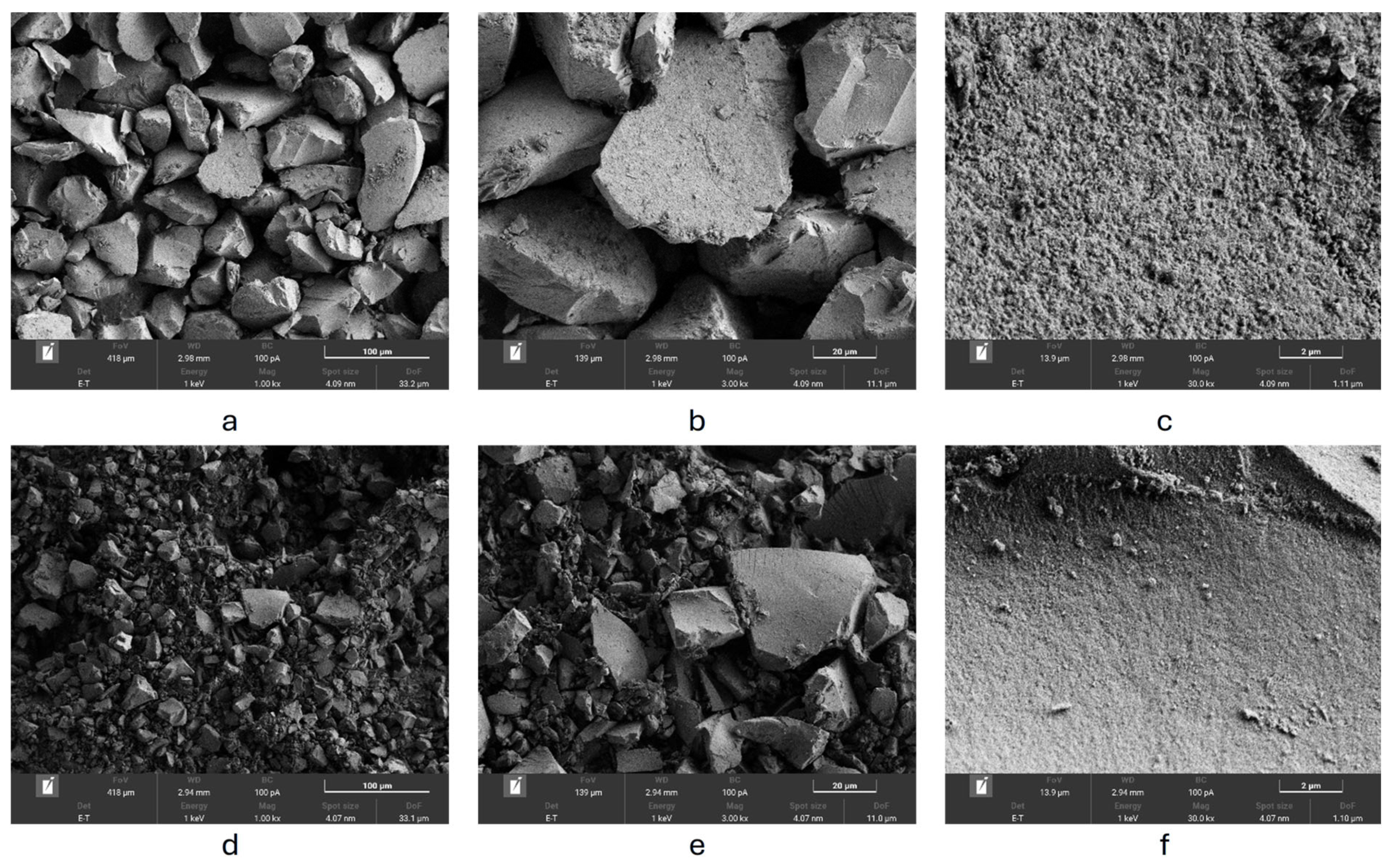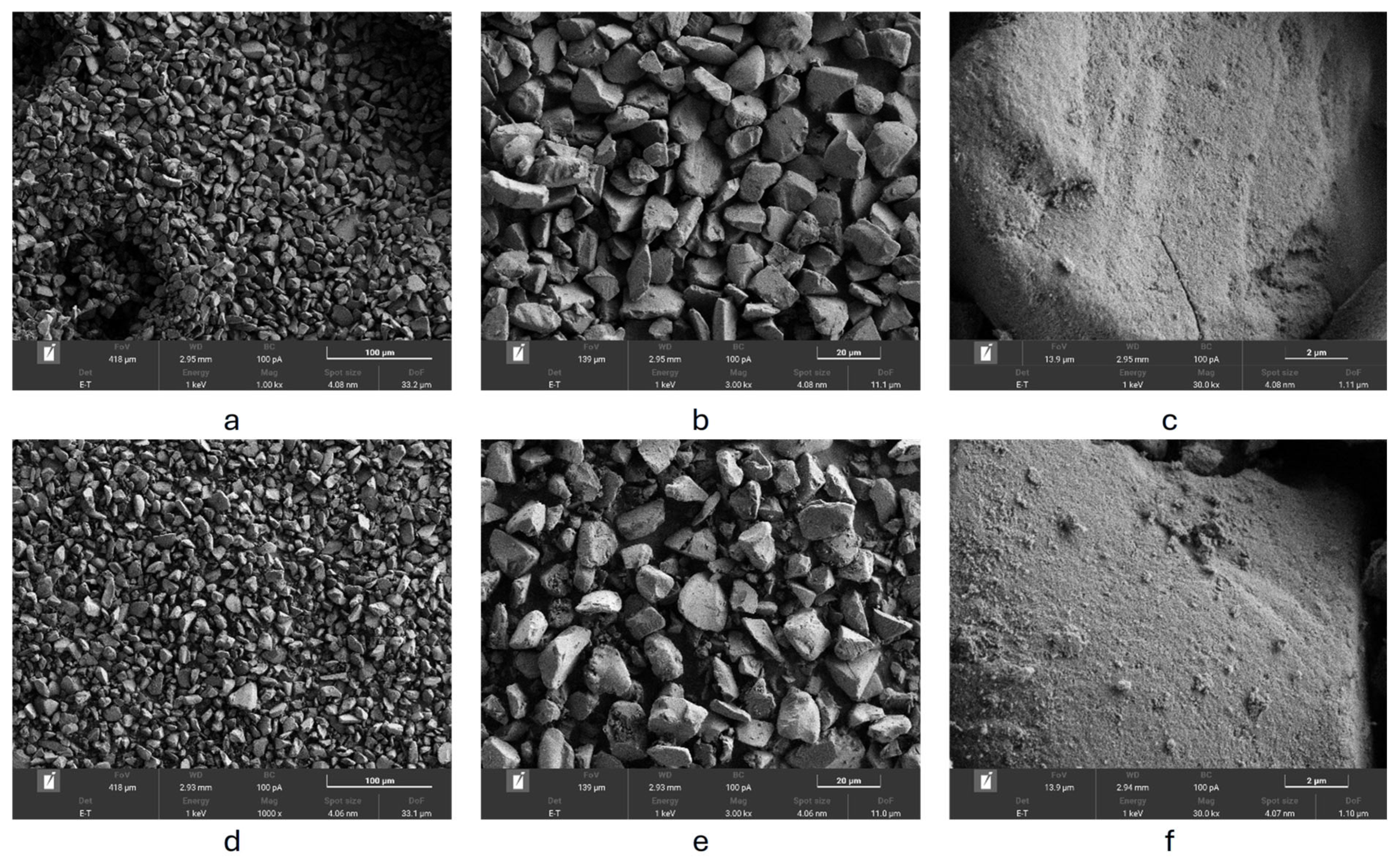 Figure 5a–c) consists of irregular, crushed-type particles with a relatively smooth surface. After modification (