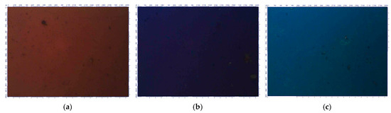 Titanium oxide films produced by the electrochemical oxidation of titanium exhibited different interference colors for different anodization voltages, as shown in Figure 1. The color of anodic film resulted from the interference of light reflected from the film’s two surfaces and is determined by its thickness. The colors shown in Figure 1 were brown (10 V), violet (15 V), and dark blue (20 V), which are in good agreement with the results presented in [18,19].