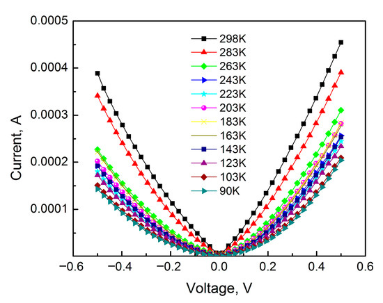 IVCs of the samples, placed on a holder of an OPTCRYO198 optical flow nitrogen cryostat (LTLab, Inc. Fukuoka, Japan) with temperature stabilization, were measured at direct current in a nitrogen atmosphere in the temperature range T = 80–300 K in 10 K steps using an automated measurement setup based on a Keithley 6487 picoammeter (Keithley Instruments, Inc., Solon, OH, USA). The voltage was varied with a variable step in the range from −0.5 V to +0.5 V. Electrical contacts to the samples were made using silver wire, which was attached to the metal electrodes with carbon or silver paste (SPI).