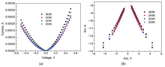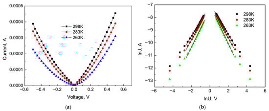 As is known, the main conduction mechanism can be identified by constructing I-V characteristics in coordinates that highlight linear regions, which can be attributed to a specific conduction mechanism. Figure 6 shows the IVC of the sample in ordinary and double logarithmic coordinates for Section I. As can be seen from Figure 6, the IVC in this section is highly dependent on temperature, which is characteristic of space–charge–limited currents (SCLC) since the degree of trap filling depends on temperature [14]. When considering the IVC of TiO2 films, it should be taken into account that at low voltages, the density of injected free charges is less than the density of intrinsic charge carriers, and therefore, Ohm’s law prevails. Consequently, ohmic conductivity takes place near the zero bias point. Therefore, for the analysis, voltages with a value higher than 0.06 V were used when the density of injected free charge carriers became greater than the density of intrinsic charge carriers. As can be seen, the experimental points are well approximated by a linear function in the logarithmic scale. This behavior of the dependence of current on bias voltage is characteristic of SCLC. Consequently, the conductivity mechanism in Section I is determined by SCLC. The IVC in this section is described by a power-law dependence of current on voltage J∞Um with m values equal to 1.24; 1.34 and 1.52 (positive region) and 1.21; 1.33 and 1.47 (negative region) for sample temperatures of 298, 283, and 263 K, respectively.