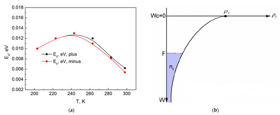 Figure 8a shows the dependence of the energy E0 on the sample temperature. As is known, the bottom of the conduction band for an amorphous dielectric is blurred, and the tail of the conduction band extends deep into the forbidden band. Instead of the bottom of the conduction band, the edge of the conduction band is indicated in the diagram. When a voltage is applied to the sample, injected electrons are captured by traps, and all traps below the Fermi level will be filled (Figure 8b).