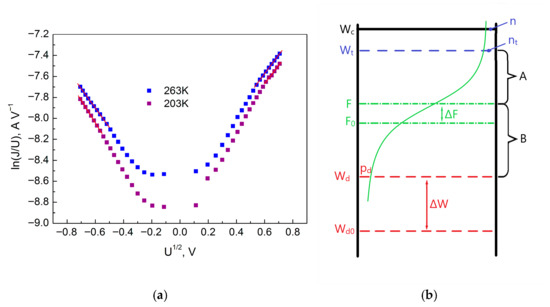 Figure 9a shows the IVC of the sample with temperatures of 263 and 203 K for Section II in the coordinates of the logarithm of conductivity versus the square root of voltage. As can be seen, the linear section on the graph for forward bias does not appear immediately, but only after the voltage reaches a value of 0.24 V. In the case of reverse bias, the linear section arises for voltages above 0.27 V. From Figure 9a, we find that the tangent of the slope (m) of the approximating curves (linear form) for T = 263 K is 1.78 (forward bias (minus on Ti)) and 1.86 (reverse bias (plus on Ti)) and for T = 203 K is 1.74 (forward bias) and 2.15 (reverse bias). Accordingly, the parameter r (ɛ = 80) for T = 203 K is 2.07 (forward bias) and 1.98 (reverse bias), and for T = 203 K is 2.12 (forward bias) and 1.72 (reverse bias). Since the value of the parameter r is close to 2, in this case, there is an anomalous Poole–Frenkel effect, which describes the behavior of the donor level in the presence of shallow traps. Small traps are located above the donor centers. Also kB T > (—characteristic energy of donors), and therefore the donor band acts as one monoenergetic level, coinciding with the maximum density of the donor band. Donor centers in anodic TiO2 can be anionic (oxygen) vacancies due to their low formation energy [8,27].
