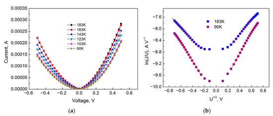 Figure 10 shows the IVC of the sample for Section III in ordinary coordinates and in the coordinates of the logarithm of conductivity versus the square root of voltage (Poole–Frenkel coordinates). From Figure 10b, we find that the tangent of the slope (m) of the approximating curves for T = 183 K is 2.19 (forward bias) and 2.57 (reverse bias), and for T = 90 K is 2.57 (forward bias) and 3.65 (reverse bias).
