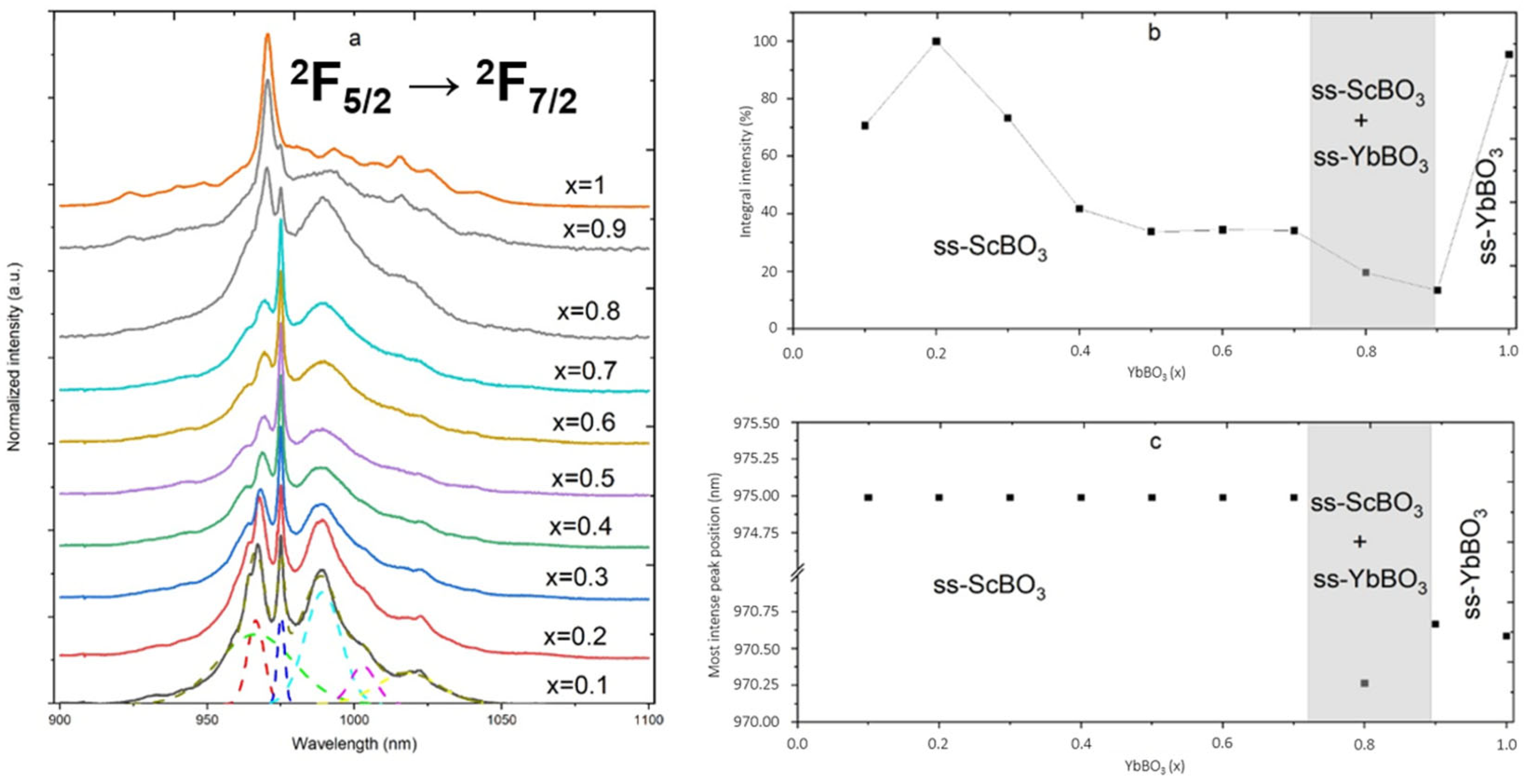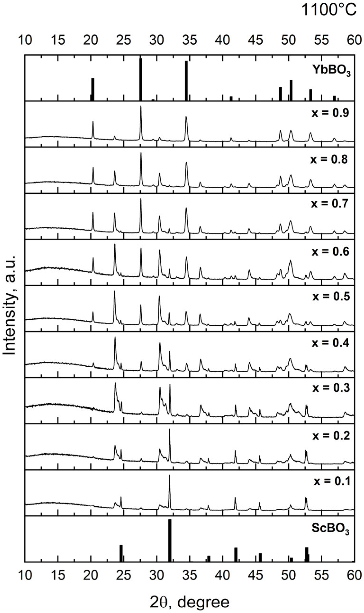 Phase Relations and Solid Solutions in the YbBO3–ScBO3 System
