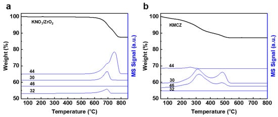 TG-MS analysis of (a) K/ZrO2, (b) KMCZ samples. The m/z value of 44, 30, 46, and 32 in MS signal corresponds to N2O, NO, NO2, and O2, respectively.