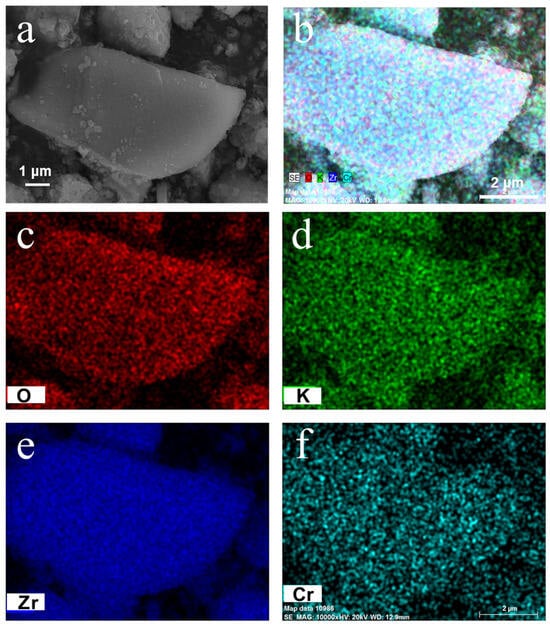 (a) SEM and (b–f) EDX-mapping of the sample KMCZ-500.