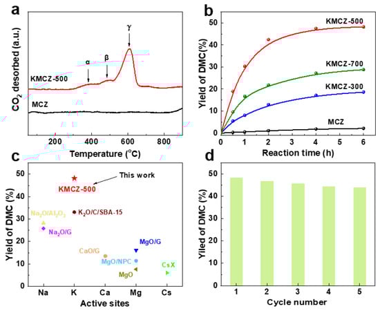(a) CO2-TPD profiles of the samples MCZ and KMCZ-500; (b) The yields of DMC under the catalysis of different samples; (c) comparison of catalytic activity with typical reported solid bases; (d) Reusability of the KMCZ-500 as the catalyst for the synthesis of DMC.