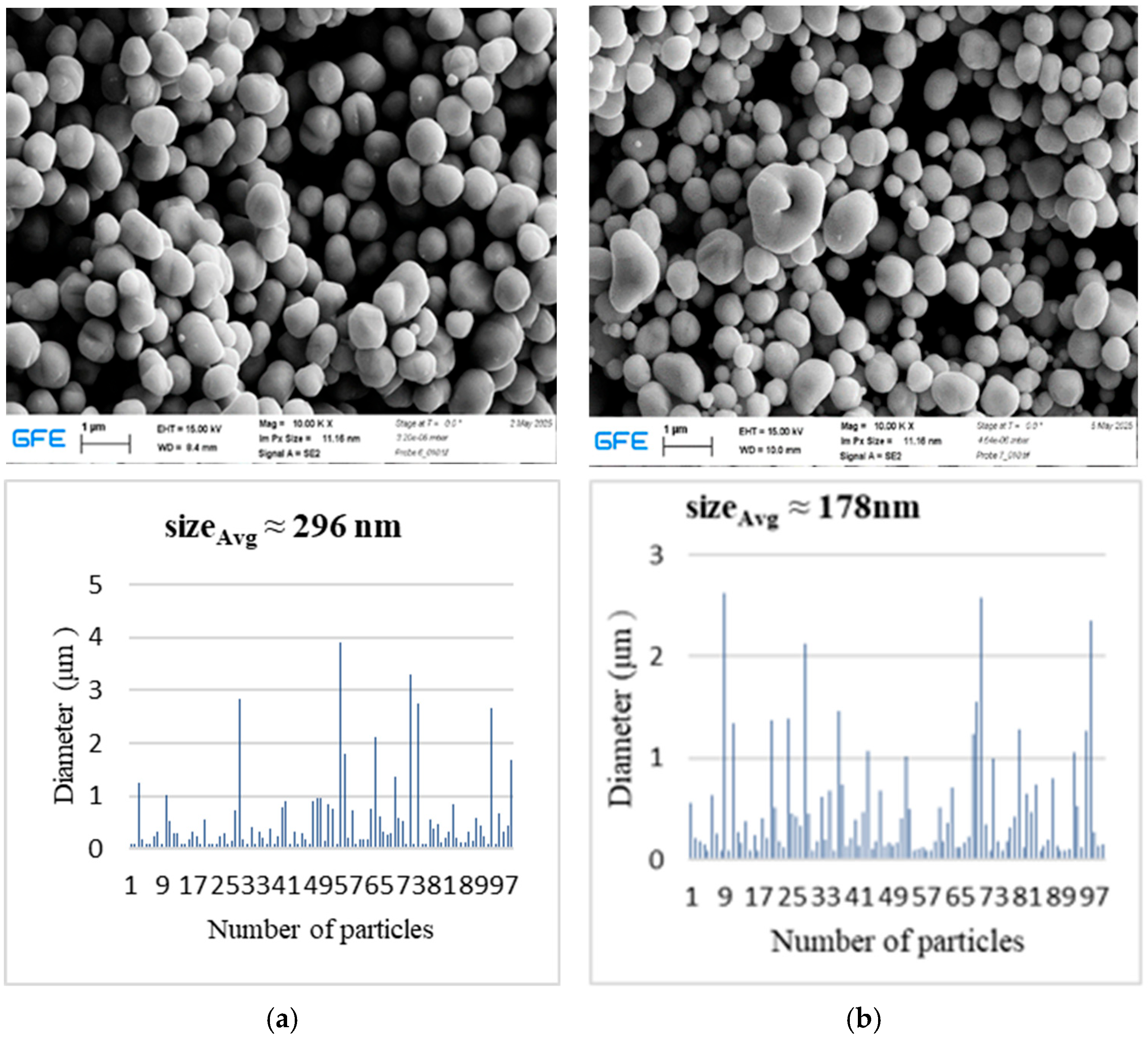 Future work will focus on incorporating complementary characterization techniques to overcome the limitations of the present analysis. X-ray diffraction (XRD) will be employed to assess crystallinity and phase composition, while TEM/HRTEM will be used to resolve internal particle structures; additionally, X-ray photoelectron spectroscopy (XPS) will be considered to evaluate surface oxidation states where relevant. Additional techniques, such as UV–Vis spectroscopy, will be considered where optical properties are relevant. Furthermore, systematic investigations of oxidation stability, particle growth behavior, and application-oriented performance—such as catalytic or plasmonic activity—are required to establish robust structure–property relationships. Thermogravimetric (TGA) and differential scanning calorimetry (DSC) analyses will also be incorporated in future studies to enable a more precise correlation between precursor decomposition behavior and particle formation during the USP–HR process.