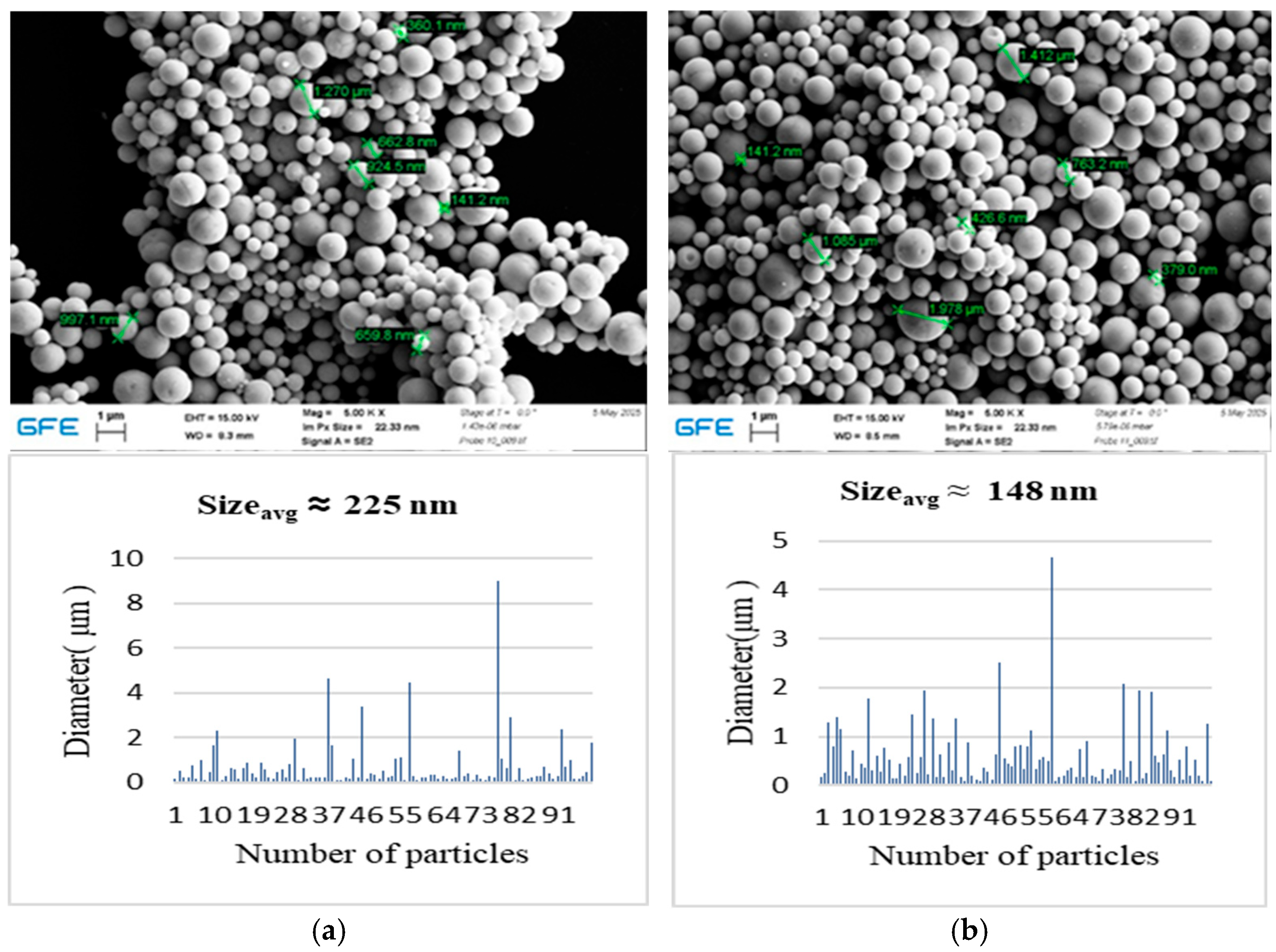 Overall, the results highlight the strong sensitivity of USP-based synthesis to processing parameters and demonstrate that controlled adjustment of temperature, gas atmosphere, and precursor composition provides an effective means of tailoring particle characteristics. The conclusions drawn in this work are based on morphological and compositional trends observed by SEM and EDS and are intended to provide process-oriented insight rather than mechanistic interpretation at the atomic scale.