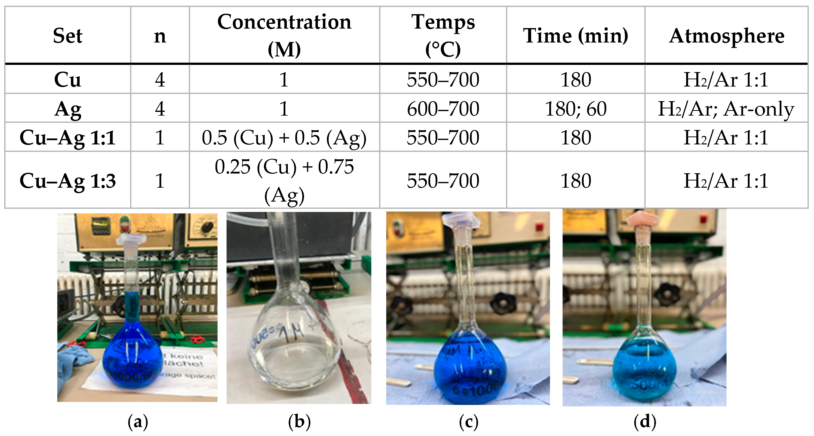 Despite these advantages, systematic studies on the synthesis of Cu, Ag, and Cu–Ag powders via USP—particularly under hydrogen-assisted reduction conditions—remain limited. Existing reports often focus on single-metal systems or rely on inert atmospheres, while the combined influence of synthesis temperature, gas atmosphere, and precursor ratio on particle morphology and compositional stability has not been thoroughly examined for Cu–Ag systems produced by USP. In particular, understanding how process parameters affect particle size distribution, agglomeration behavior, and susceptibility to post-synthesis oxidation is essential for tailoring materials for practical applications.