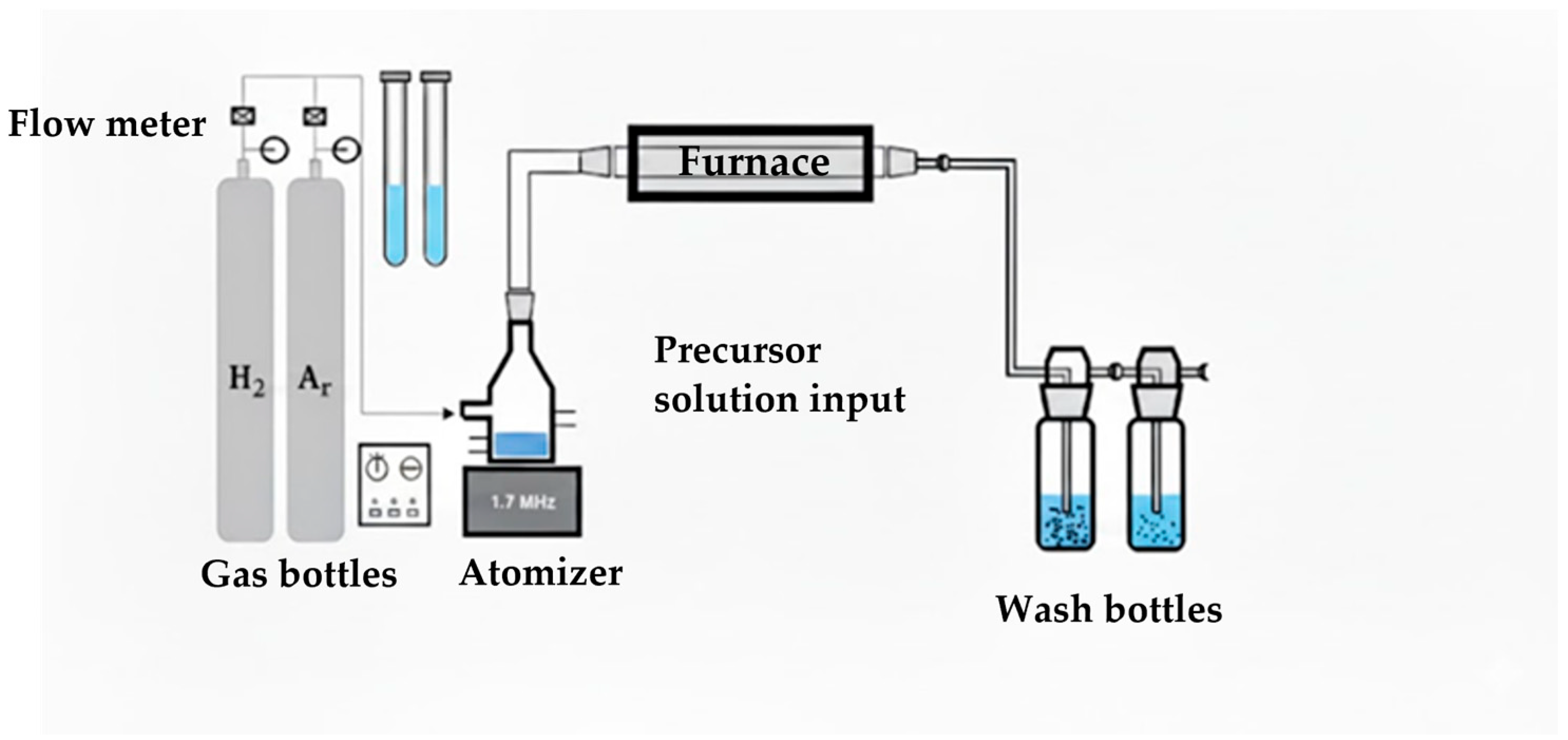 Ultrasonic spray pyrolysis (USP) represents an alternative gas-phase synthesis technique that enables continuous production of fine powders from liquid precursor solutions. In USP, precursor droplets generated by ultrasonic atomization undergo solvent evaporation, thermal decomposition, and particle formation within a high-temperature reactor. Compared to wet chemical methods, USP offers several advantages, including a continuous and scalable process, relatively short residence times, precise control over precursor composition, and reduced risk of contamination from organic additives. When combined with a reducing atmosphere, USP can be adapted for the synthesis of metallic and bimetallic particles with controlled morphology and composition [