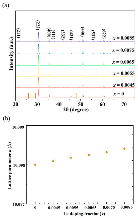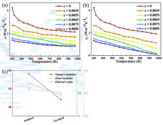 ph. Additionally, the lattice distortion caused by La doping introduces defects (e.g., substitutional atoms, lattice vacancies), and the reduced Young’s modulus enhances the interaction between these defects and phonons. The combined effect of stronger phonon–phonon scattering and defect–phonon scattering significantly shortens the phonon mean free path, further reducing κ