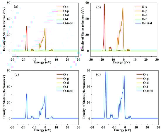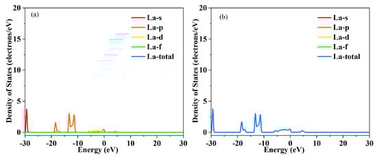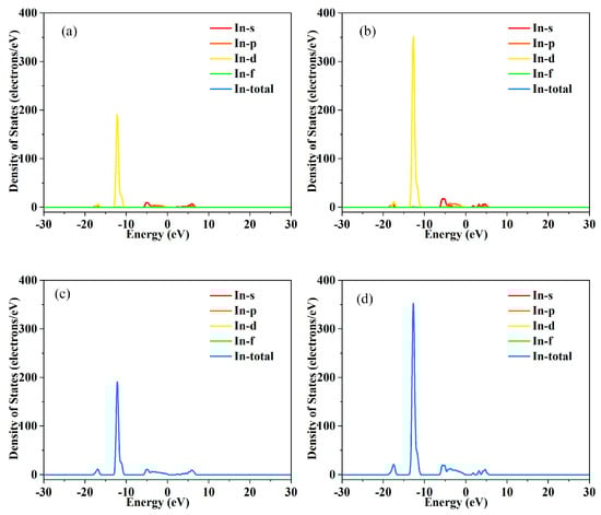 Figure 6. This interaction leads to the convergence of multiple energy bands near the Fermi level, forming a broader and more continuous energy band region. Band convergence directly increases the density of states near the Fermi level. A higher density of states means that there are more electronic states available for occupation at the same energy level, which not only promotes the excitation of electrons from the valence band to the conduction band but also enhances the carrier concentration. At the same time, the continuous energy band formed by convergence reduces the energy barrier for carrier transport. Carriers can move more smoothly between different energy bands, reducing the scattering probability during the transport process to a certain extent. The bandgap values obtained through first-principles calculations are as follows: ~1.12 eV for the undoped, ~0.86 eV for La doped. After doping with La, the density of electronic states at the bottom of the conduction band is significantly enhanced, and the energy required for valence band-conduction band transitions decreases, manifesting macroscopically as a contraction of the optical bandgap. The hybridization between La’s 4f orbitals and In’s 5s, 5p orbitals, as well as O’s 2p orbitals, forms new impurity energy levels in the forbidden band. These energy levels serve as an “intermediate bridge” for electronic transitions, effectively reducing the effective bandgap. For the maintenance of lattice charge neutrality, the key lies in the synergistic effect of ion valence adjustment and defect compensation. Specifically, when La