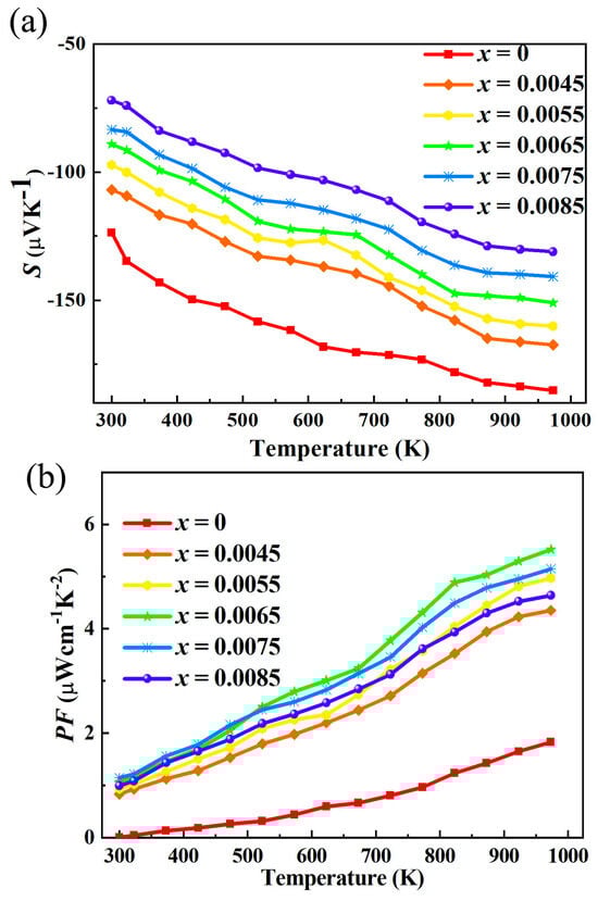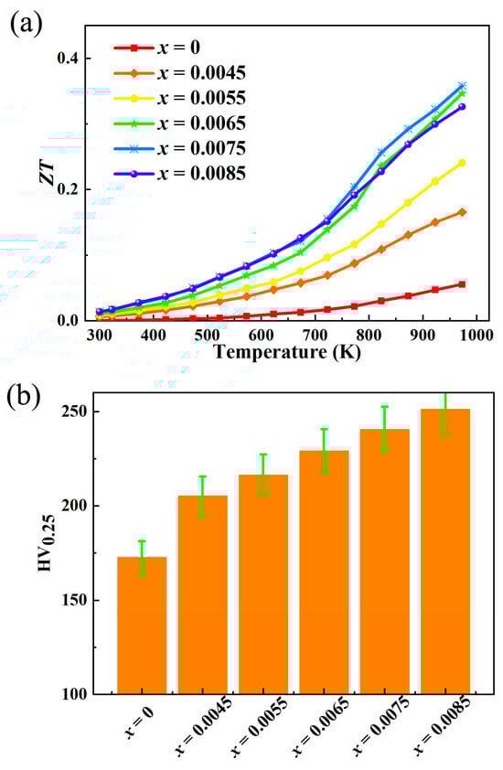 Figure 9a—from 0.055 to 0.358—stems from the synergistic optimization of electrical transport properties (enhanced power factor) and thermal transport properties (reduced total thermal conductivity and lattice thermal conductivity) by La doping. The highest ZT value reached 0.358, which is lower than 0.402 for Bi doping [