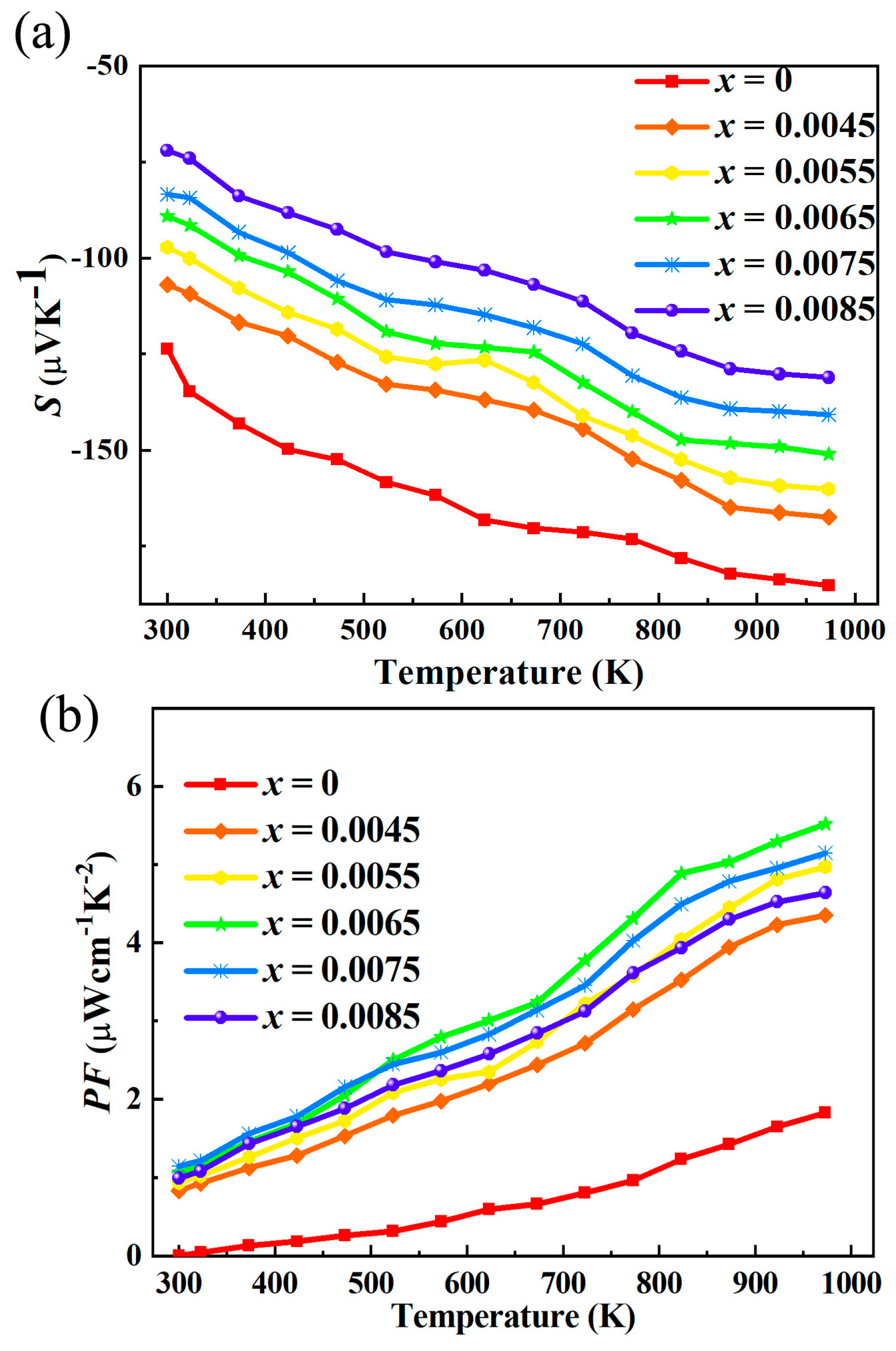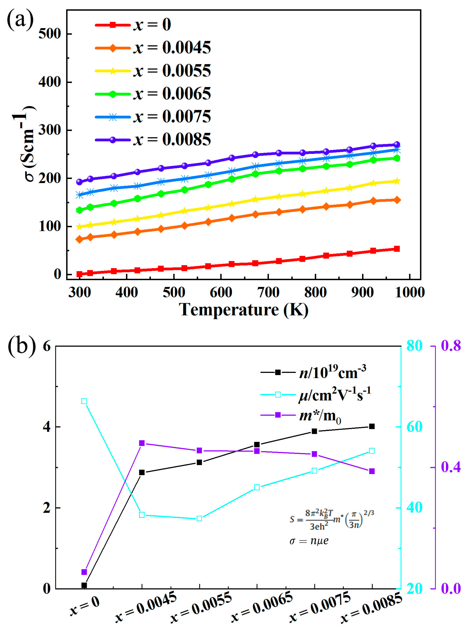 3+, the introduction of La ions destroys the periodicity of the original lattice, leading to lattice defects such as lattice distortion and strain. These defects act as scattering centers for carriers, increasing the probability of carrier-lattice scattering during the transport process, thereby reducing the carrier mobility. In addition, the increase in carrier concentration also leads to an enhancement of carrier-carrier scattering. With the increase of free electron concentration, the interaction between electrons becomes more intense, which increases the collision probability between carriers. This carrier-carrier scattering further inhibits the movement of carriers, resulting in a decrease in mobility. However, the degree of mobility reduction is relatively mild, which is mainly due to the band convergence effect. Band convergence optimizes the electronic band structure of In