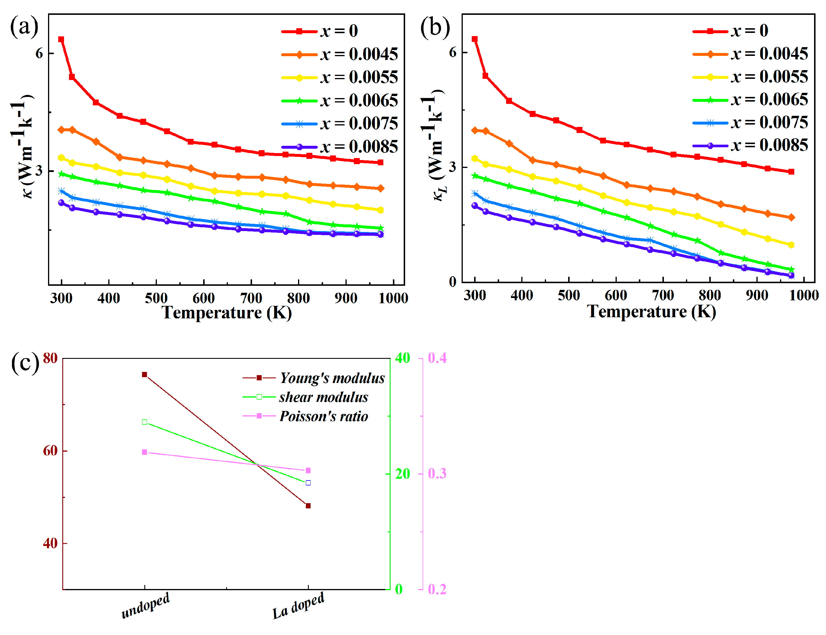 l ultimately results in a decrease in total thermal conductivity, further optimizing the ZT value. The significant improvement in ZT value (from 0.055 to 0.358) is the result of the synergistic effect of power factor enhancement and thermal conductivity reduction, both of which are rooted in the structural and electronic regulation induced by La doping. On the one hand, La doping optimizes electronic transport: increasing carrier concentration to enhance electrical conductivity, and inducing band convergence to maintain a moderate Seebeck coefficient, thereby boosting the power factor. On the other hand, it suppresses thermal transport: lattice distortion and reduced Young’s modulus jointly reduce lattice thermal conductivity, and the dominant contribution of κ