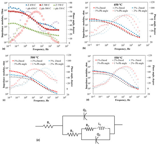Figure 2a–d show the EIS results of tungsten electrode at open circuit potentials in eutectic with and without the addition of 1–5 wt% at 450–550 °C. Figure 2a shows the Bode plots of the tungsten working electrode in at different temperatures without addition. The impedance moduli decreased with increasing temperature, which could be attributed to higher ion diffusivity at higher temperatures, driven by lower viscosity. The phase angles varied with frequency, and the peak values were about −70°, indicating a leaky capacitance behavior at 450 °C and 500 °C. The frequency at which the phase angle peak occurred increased with increasing temperature (1.5 Hz at 450 °C to 25 Hz at 500 °C), indicating a decrease in the time constant due to the reduced resistance or capacitance. The variation in the phase angle as a function of temperature follows the trend of the impedance modulus. Figure 2b–d illustrate the Bode plots at 450, 500, and 550 °C for three additions.