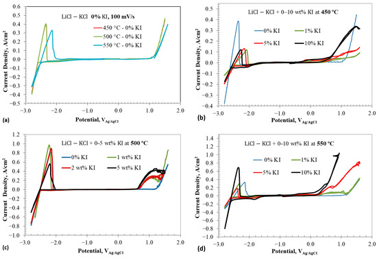 Figure 3a–d illustrate the cyclic voltammograms of containing different additions at various temperatures. Figure 3a shows the full window CV of eutectic without any addition at three different temperatures: 450, 500, and 550 °C. The CV results of 0% show redox peaks associated with lithium reduction and oxidation at around −2.4 VAg/AgCl and chlorine evolution at +1.1 VAg/AgCl. No other redox peaks are observed. Increasing the temperature decreases the stability window of the eutectic mixture by about 40 mV per 50 °C rise. Figure 3b displays the CV results of eutectic with 1–10 wt% addition at 450 °C. In addition to the reduction/oxidation peaks of lithium and chlorine evolution, redox waves linked to iodine species are observed. Details on these redox reactions will be discussed based on CV results carried out within narrow potential windows. Figure 3c,d show the full window CV results of eutectic with 1–10 wt% at 500 and 550 °C, respectively. The addition of decreases the reduction and oxidation current density of lithium. Interestingly, no direct correlation between the reductions in current densities and concentration is evident. This suggests that the decrease in lithium redox current densities could be due to iodide ion adsorption on the working electrode, blocking sites for lithium reduction. Likely, the adsorption sites of iodide on the working electrode saturate below 1 wt% , which explains the lack of significant differences in lithium reduction currents beyond 1 wt% . Furthermore, addition affects the chlorine evolution reaction by forming interhalide complexes, as discussed earlier.