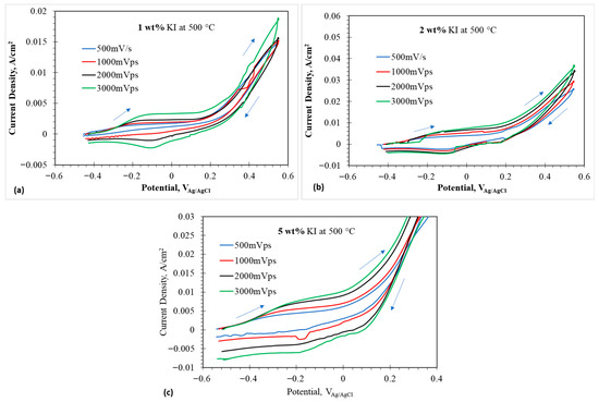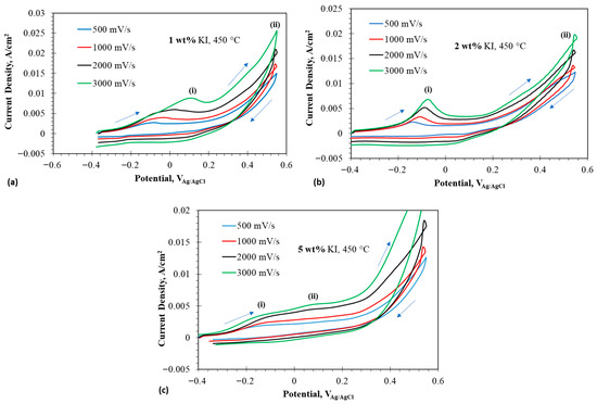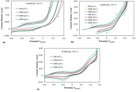Small window CVs of 1, 2, and 5 wt% at 500 °C are given in Figure 5a–c. Compared to 1, 2, and 5 wt% at 450 °C, a prominent peak was observed in reverse scan direction, which represented an electrochemical reaction occurring during the reduction process. The first peak observed in 1 wt% represented the oxidation of iodide to triiodide given by Equation (2). The current density appears to increase above 0.2 V, indicating the formation of the interhalide species , as given by Equation (13). The peak at 0.3 V represents the reaction (A8). Similar behaviors are observed in 2 and 5 wt% at 500 °C.
