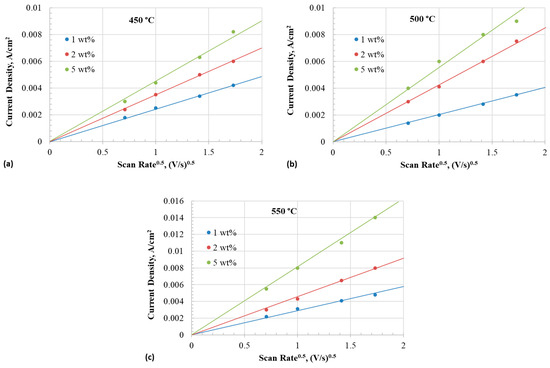 Anodic peak current density of iodide to triiodide reaction as a function of square root of scan rate at different temperatures with 1–5 wt% iodide addition in eutectic. (a) 450 °C, (b) 500 °C, and (c) 550 °C.