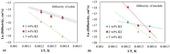 Arrhenius plots of diffusivity at different additions. (a) Diffusivities of iodide () and (b) diffusivities of triiodide ().