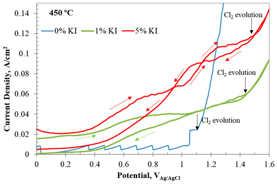 Table 5 lists the formal potentials of different reduction reactions involving iodide and chloride ions in the eutectic at various temperatures, estimated from cyclic voltammograms. The redox potential of chlorine in neat (without ) was found to be 1.114 V at 450 °C and approximately 1.134 V at 500 and 550 °C.