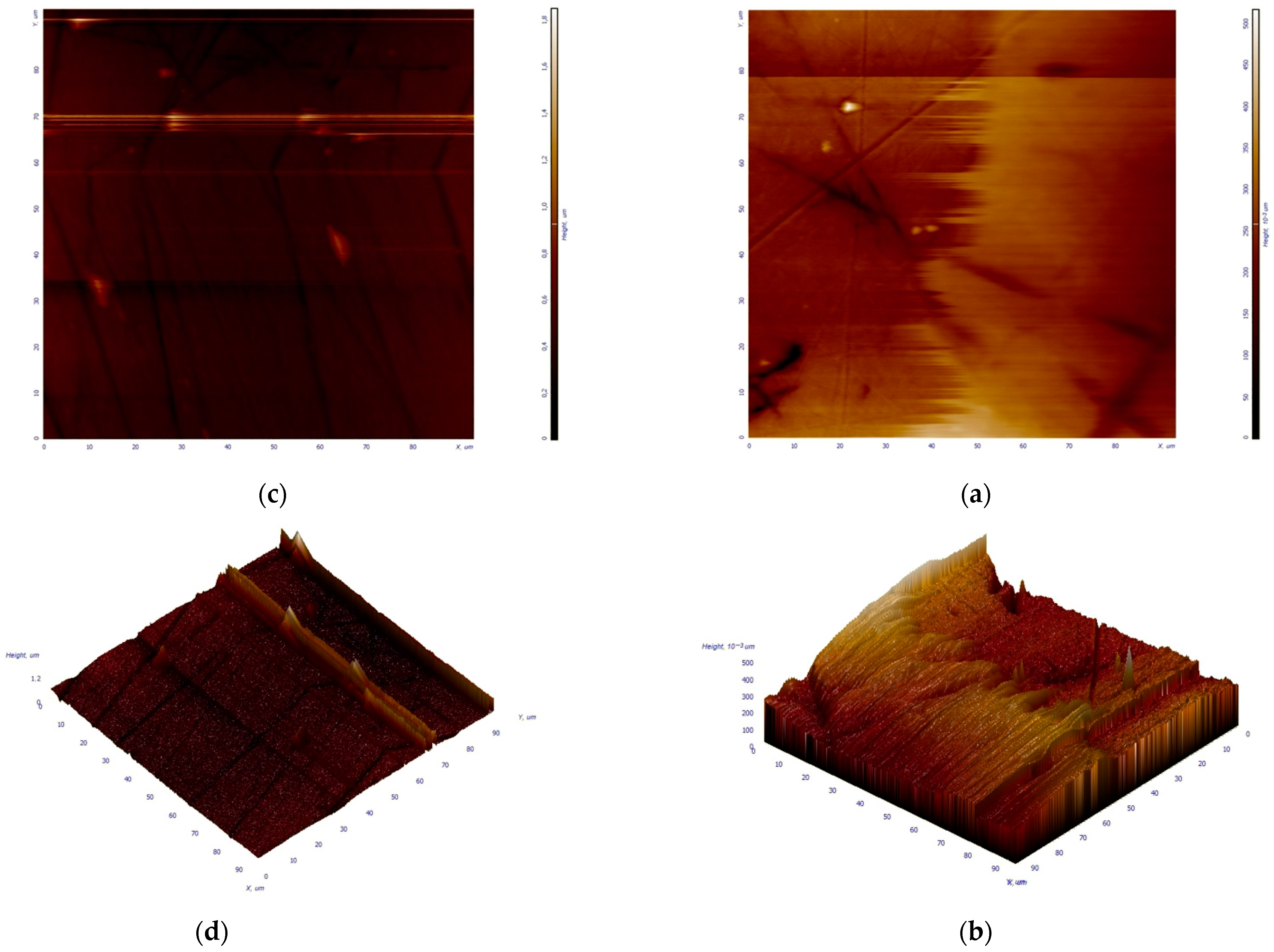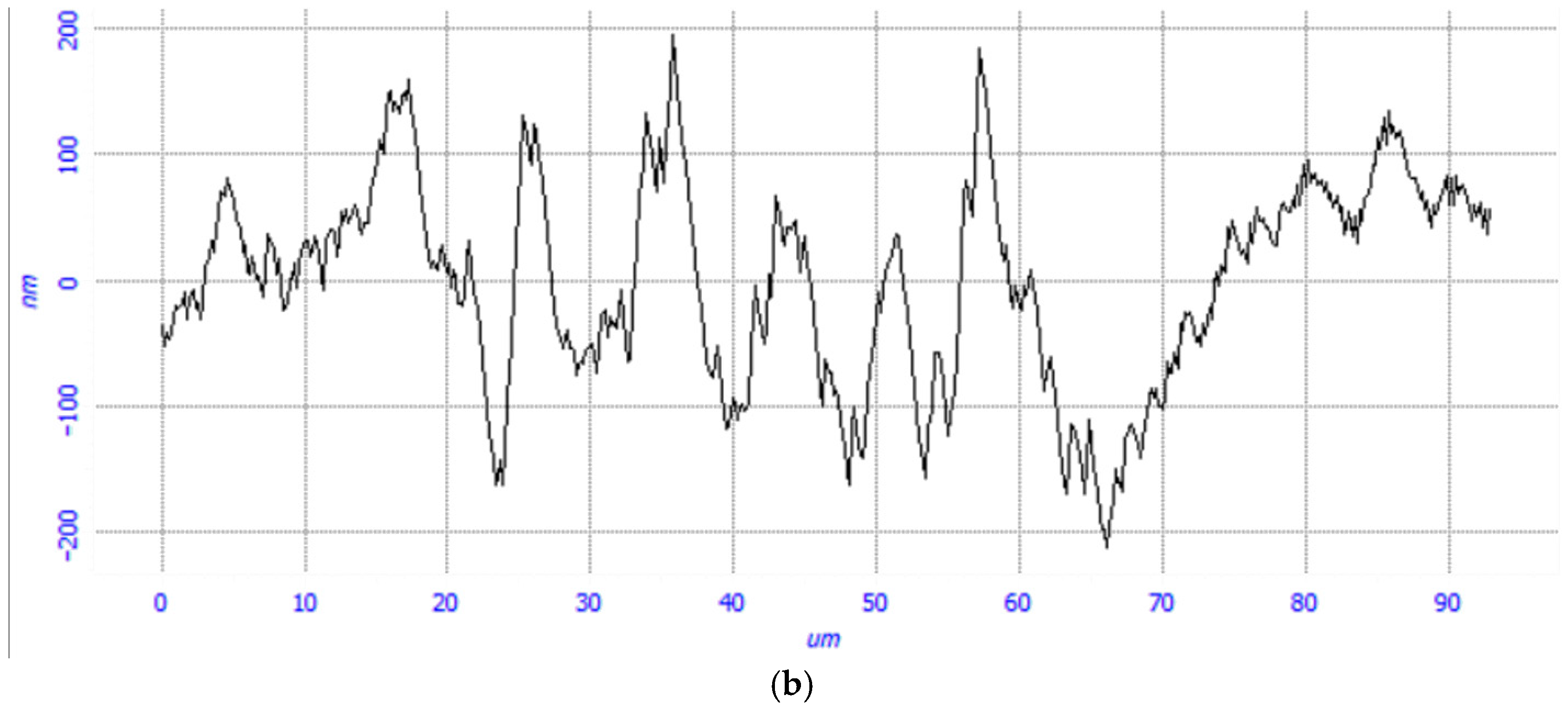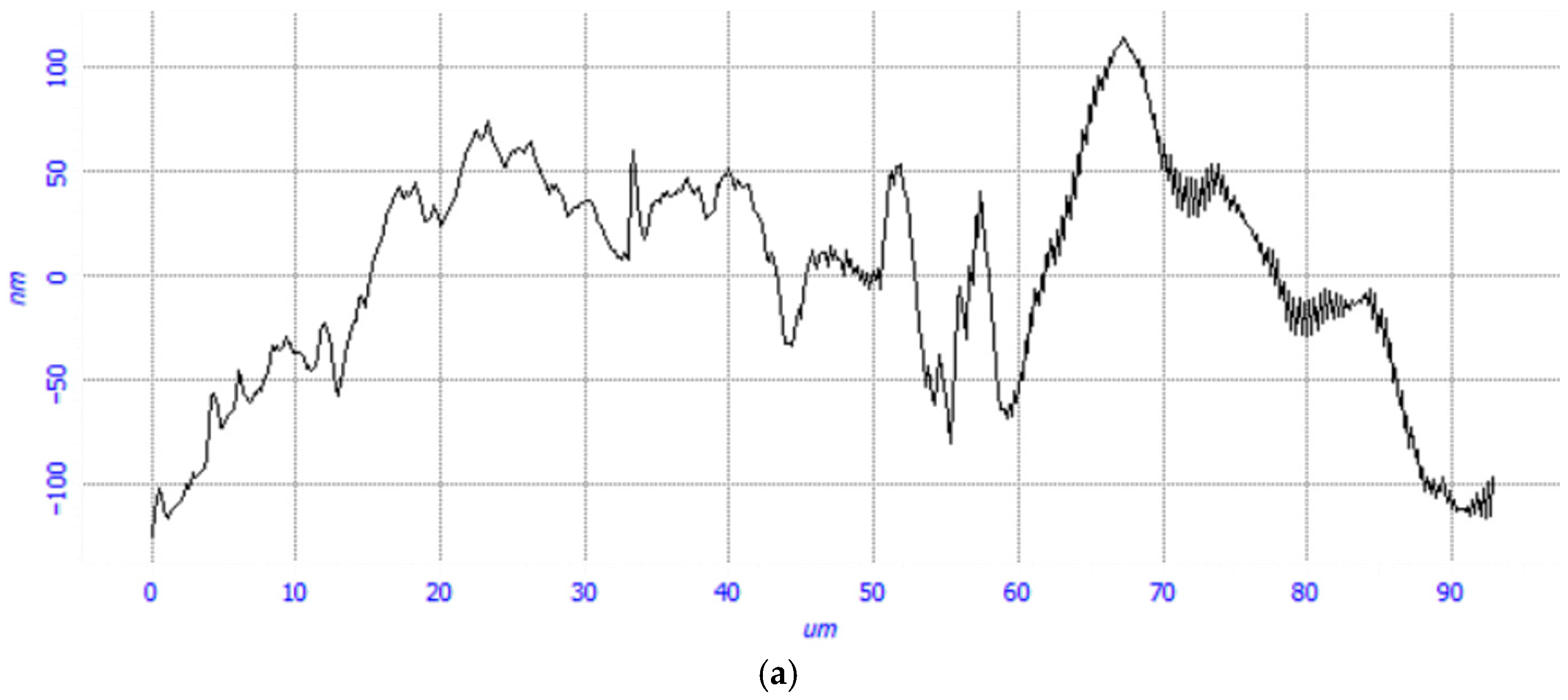 Figure 13 show views of an AFM set and a schematic method for measuring roughness using AFM. The measuring range of linear dimensions is 0–93 μm in plane (relative deviation is 1%) and 0–10 μm in height (relative deviation is 5%). The data was processed using the Nova Px software.