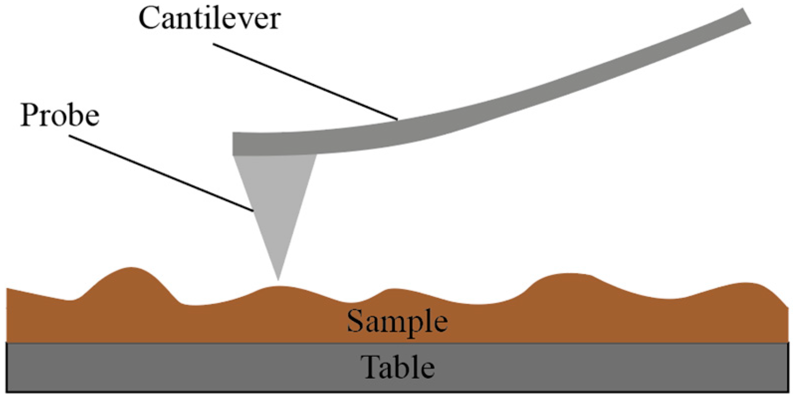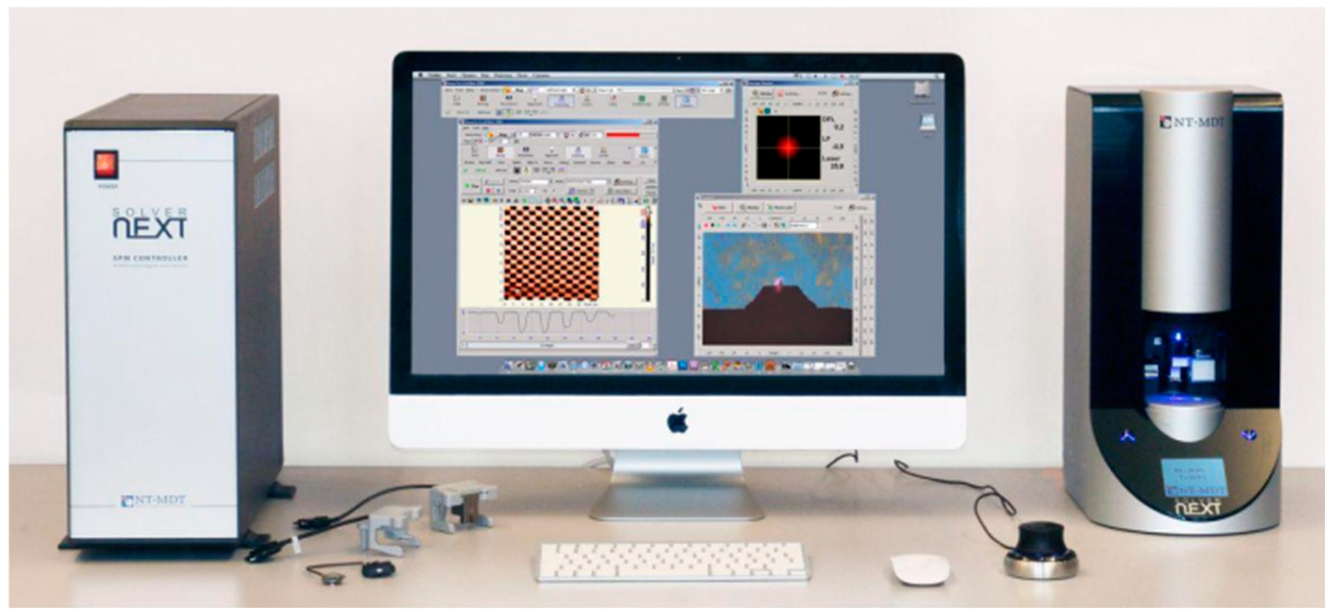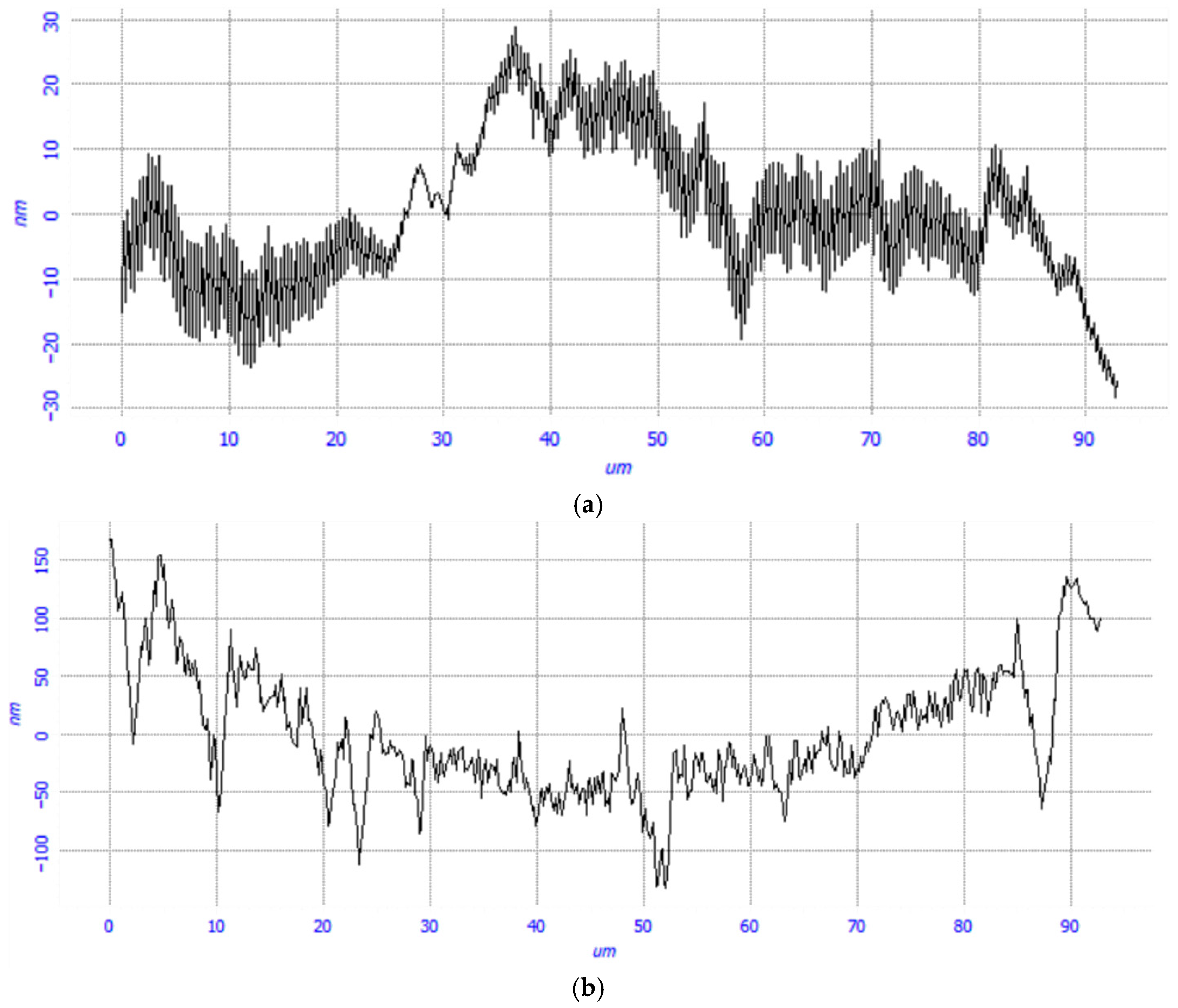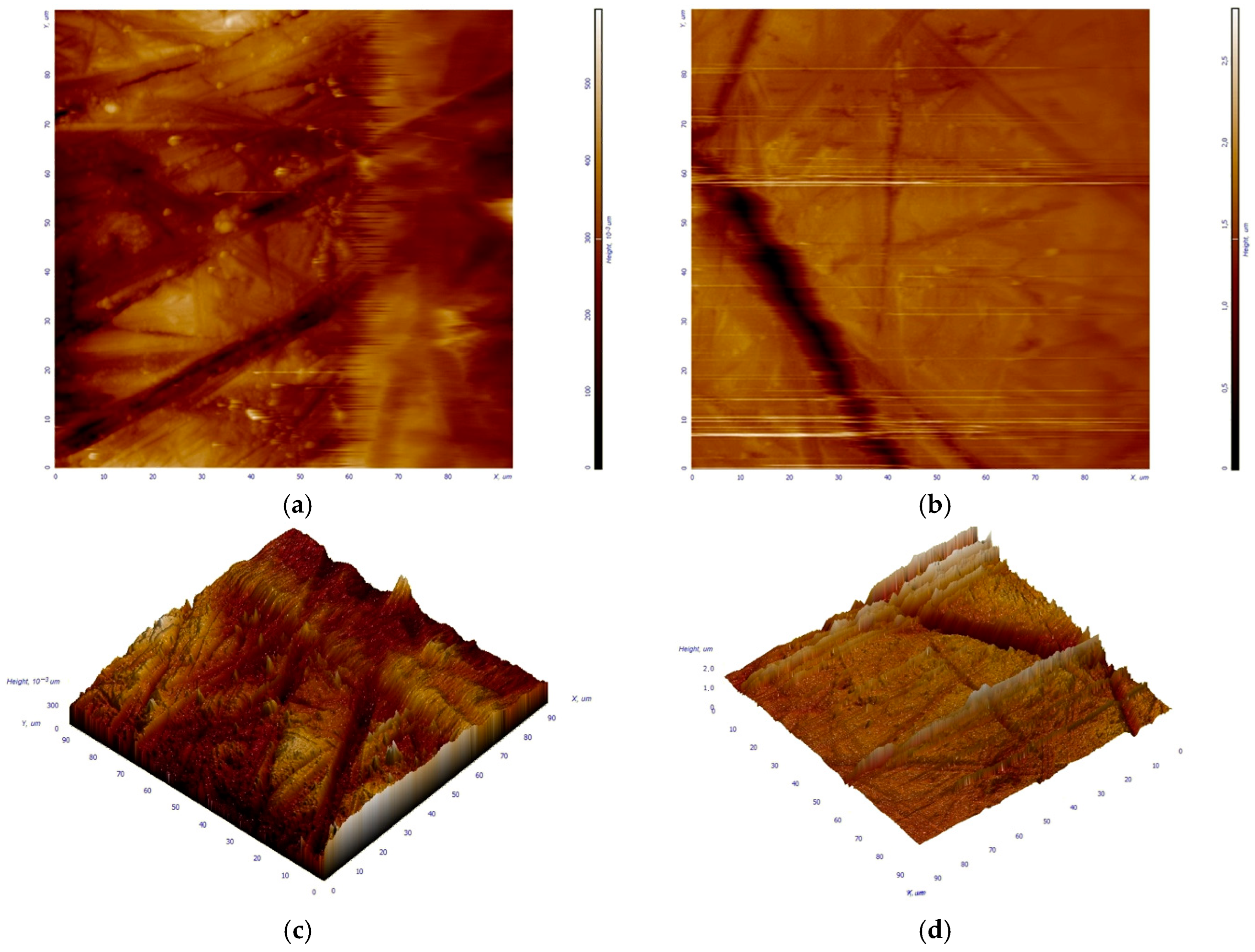 Figure 13 show views of an AFM set and a schematic method for measuring roughness using AFM. The measuring range of linear dimensions is 0–93 μm in plane (relative deviation is 1%) and 0–10 μm in height (relative deviation is 5%). The data was processed using the Nova Px software.