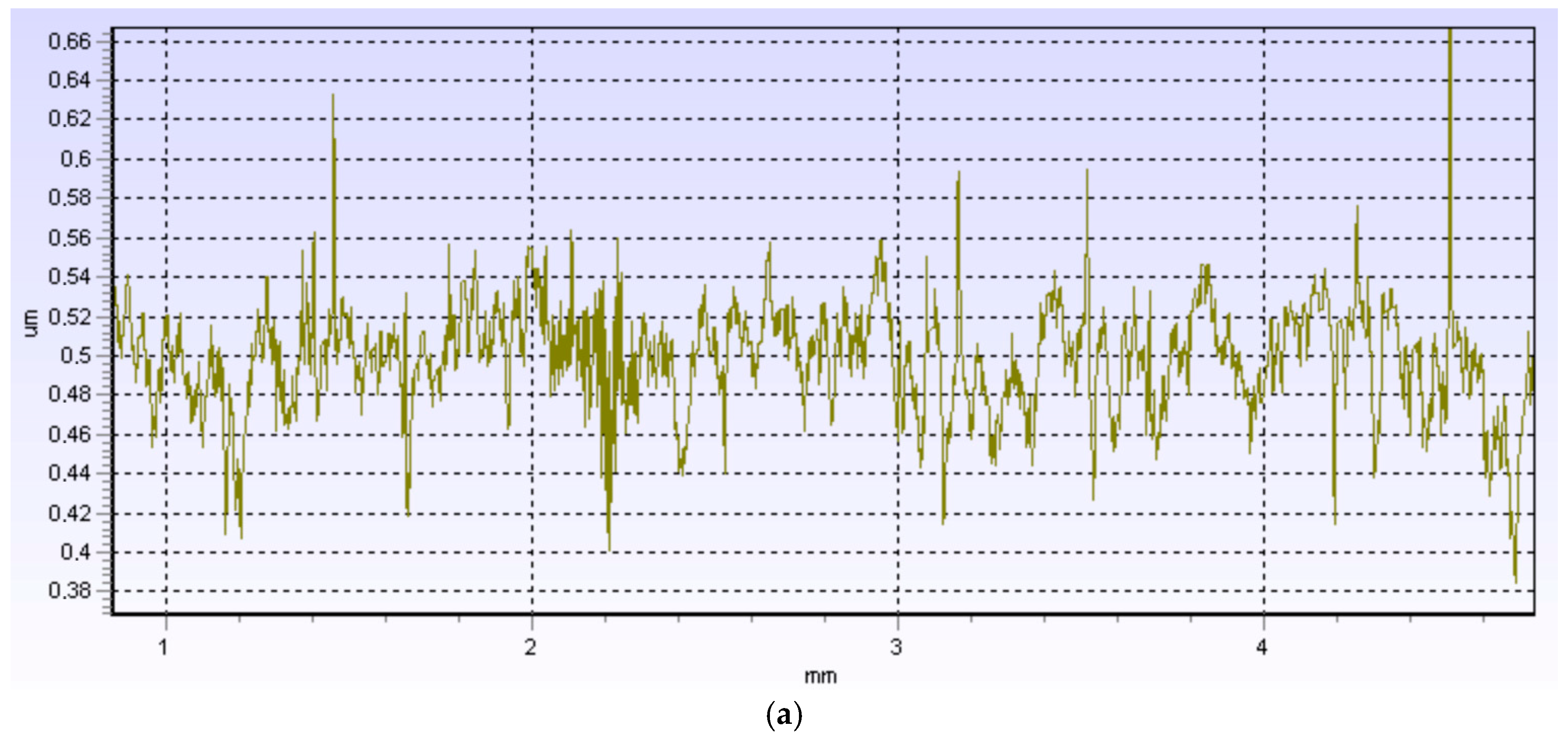 Figure 14). The roughness of the samples was registered in the range of 0–40 μm. The measurements were performed in 10 μm increments (deviation is 10%). The measuring scheme is presented in