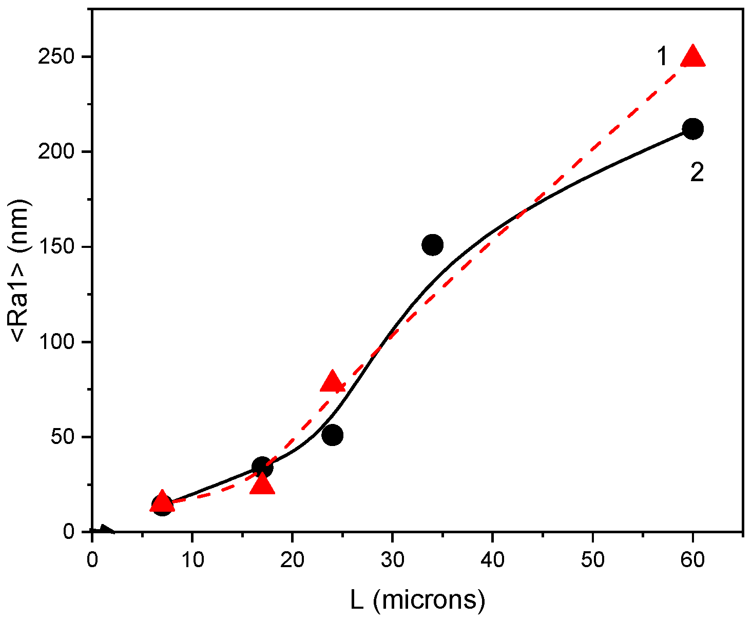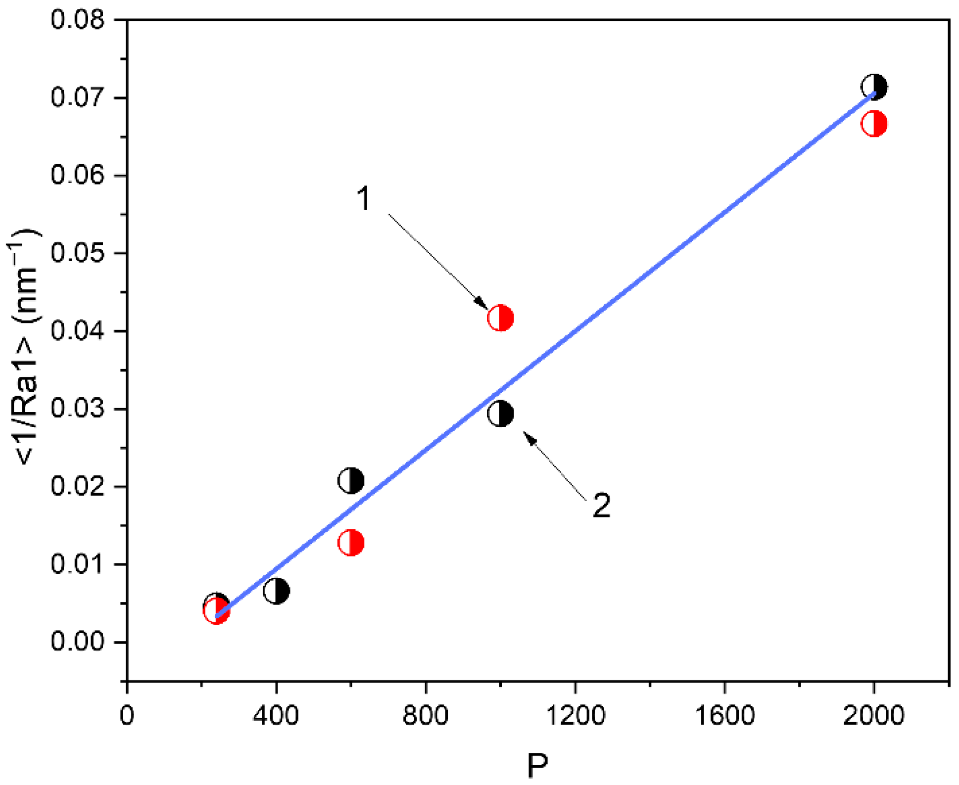 Thus, the measurements of <Ra1> using AFM and profilographic data can be represented by a common straight line 1/<Ra1> = −0.00583 + 3.8 × 10−5 × P (nm) (R2 = 0.994) that makes it possible to calculate the intermediate values of the HCS roughness with sufficient accuracy using interpolation in the range of 240 < P < 2000.