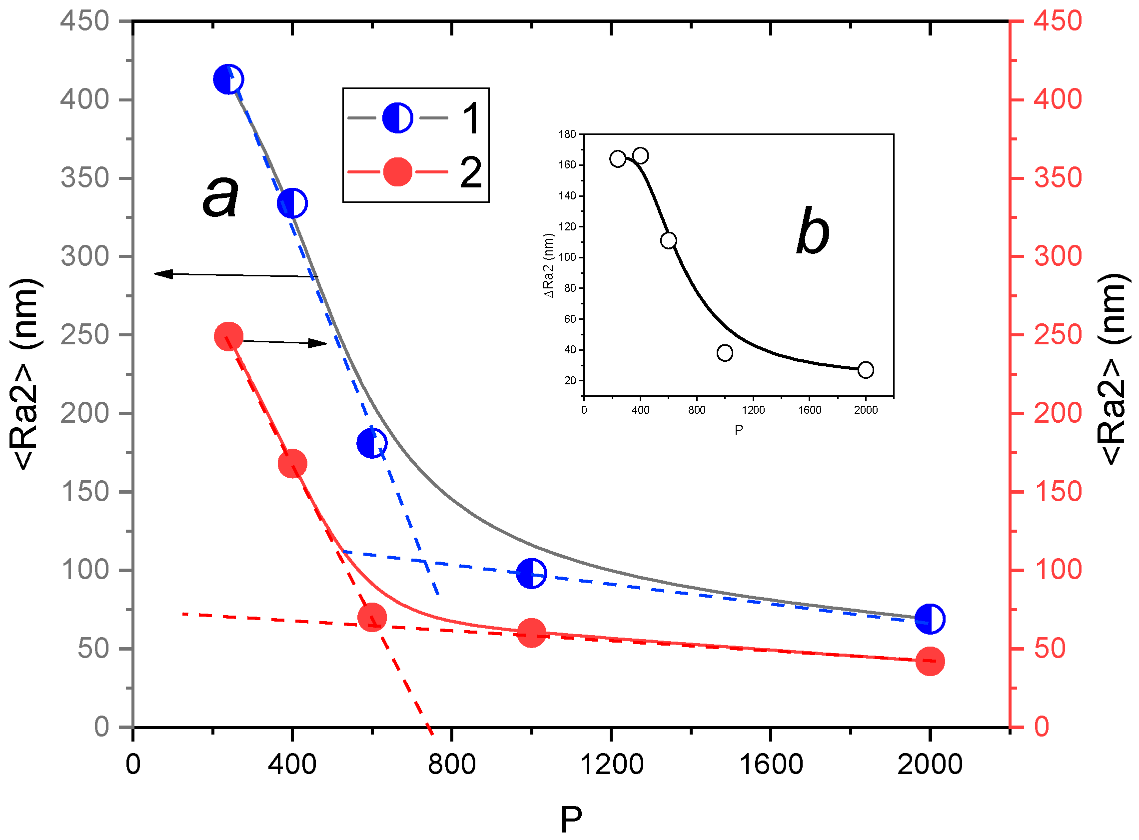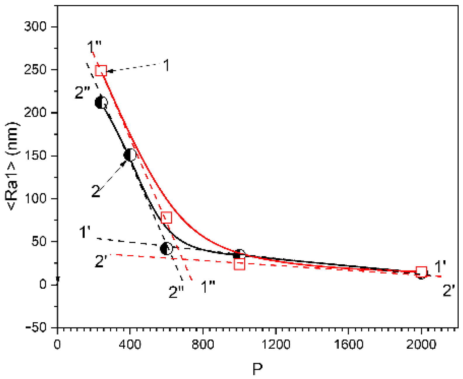 It is particularly important that this phenomenon is observed using both profilographic and AFM data at the same values of P index of the sandpaper, despite there being a significant discrepancy between the corresponding roughness obtained using profilographic and AFM measurements, ∆Ra2 = (Ra2)’ − (Ra2)’’, where (Ra2)’ and (Ra2)’’ are measurements obtained using profilographic and AFM data, respectively.