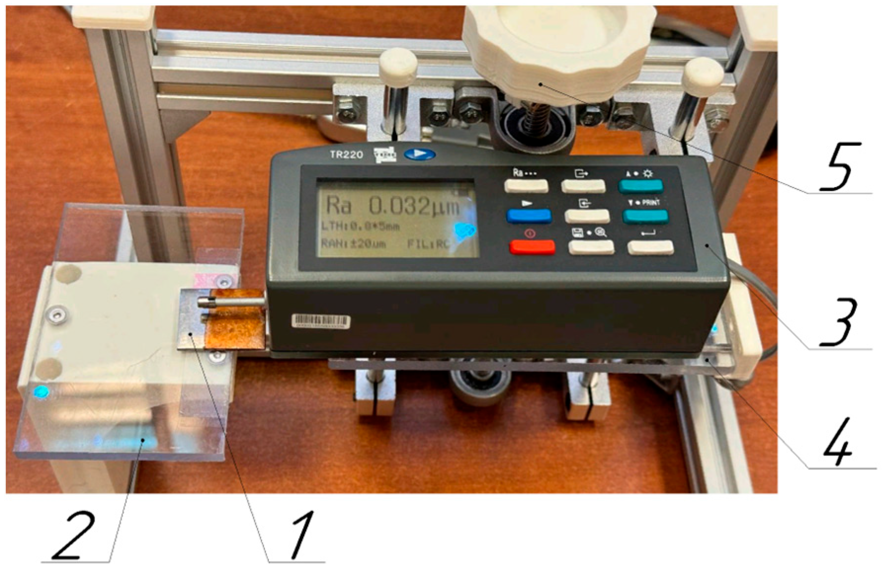 Before electrolysis, samples 1–5 were polished on an abrasive disc of Ryobi Shleifer Machine (Hong Kong, China,), the rate of which being monitored within the range of 10,000 r/min and vibration amplitude of 2.4 mm. The roughness of the polished samples was studied using AFM and Profilograph instrument. Profilograph (TR220 Profilograph) was used to compare the results of the surface roughness obtained by different methods. The results of polishing are listed in