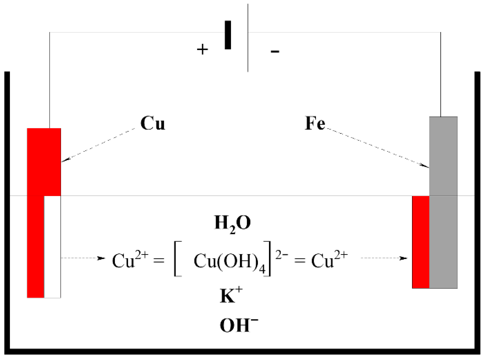 Electrodeposition of metals is based on a reduction of the metal cations on the surface of a negatively charged electrode. At the same time, some metals are known to form soluble hydroxide complexes. However, the formation of the hydroxide compounds of metal ions leads to “overcharge” of the Cu2+ cations to yield negatively charged anions [Cu(OH)4]2−.