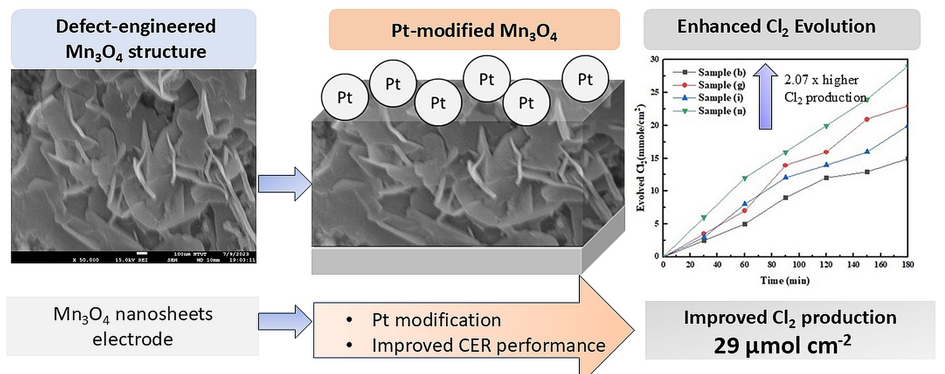 These results provide preliminary evidence that the Pt-modified Mn3O4 electrode possesses promising short-term operational stability and structural robustness under chlorine evolution conditions. Nevertheless, more comprehensive durability evaluation, including longer chronopotentiometric or chronoamperometric testing together with post-test surface and compositional characterization, is still required for a full practical lifetime assessment.