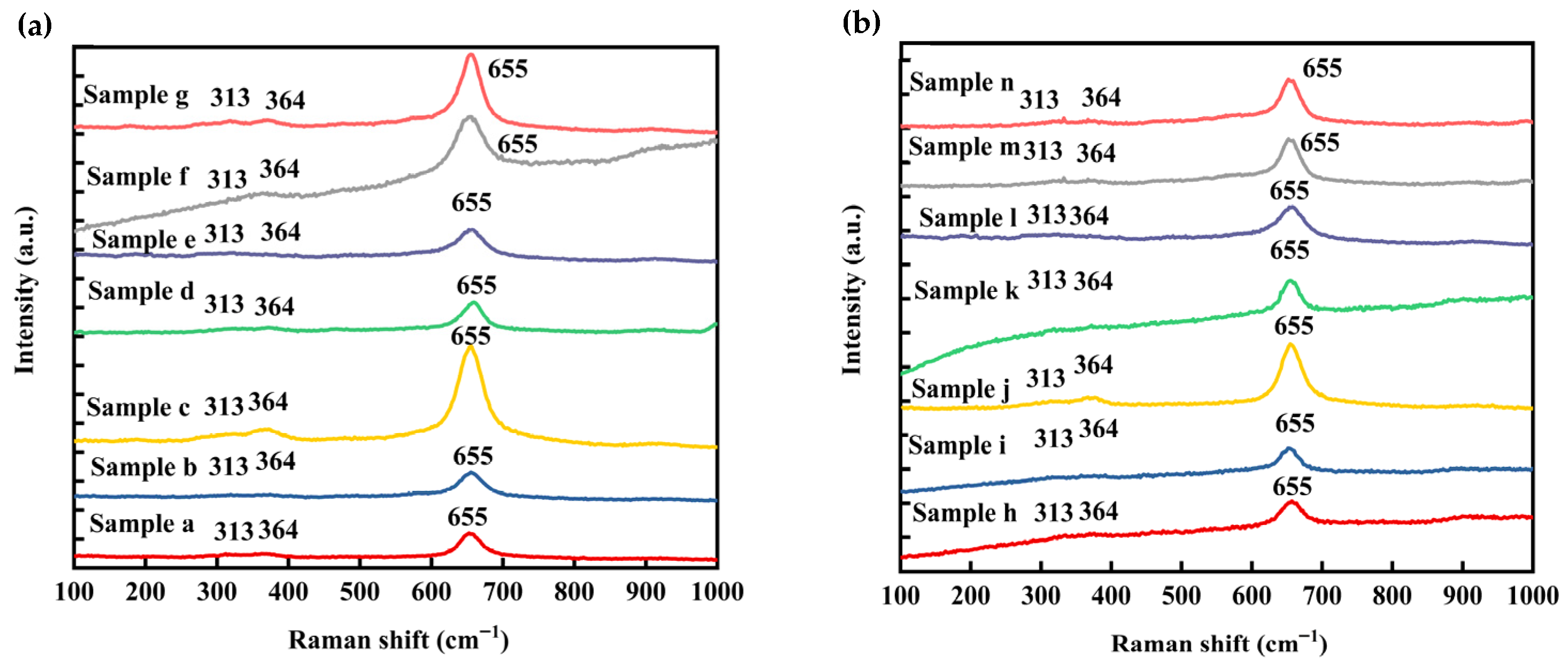 −1. All samples exhibit a consistent set of Raman features centered at approximately 313, 364, and 655 cm