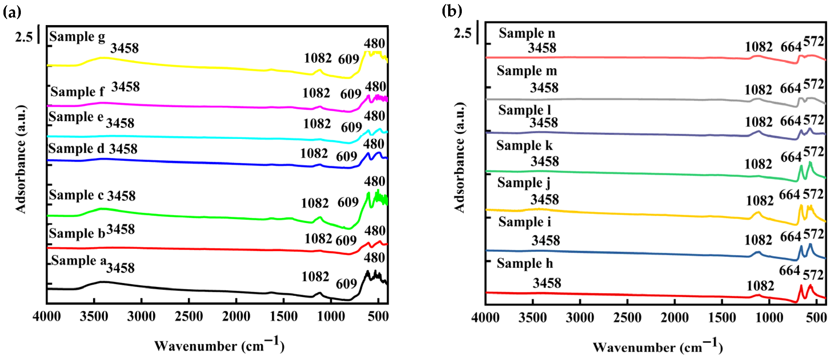 −1. All samples show a consistent set of absorption features, with pronounced bands located at approximately 480 and 609 cm