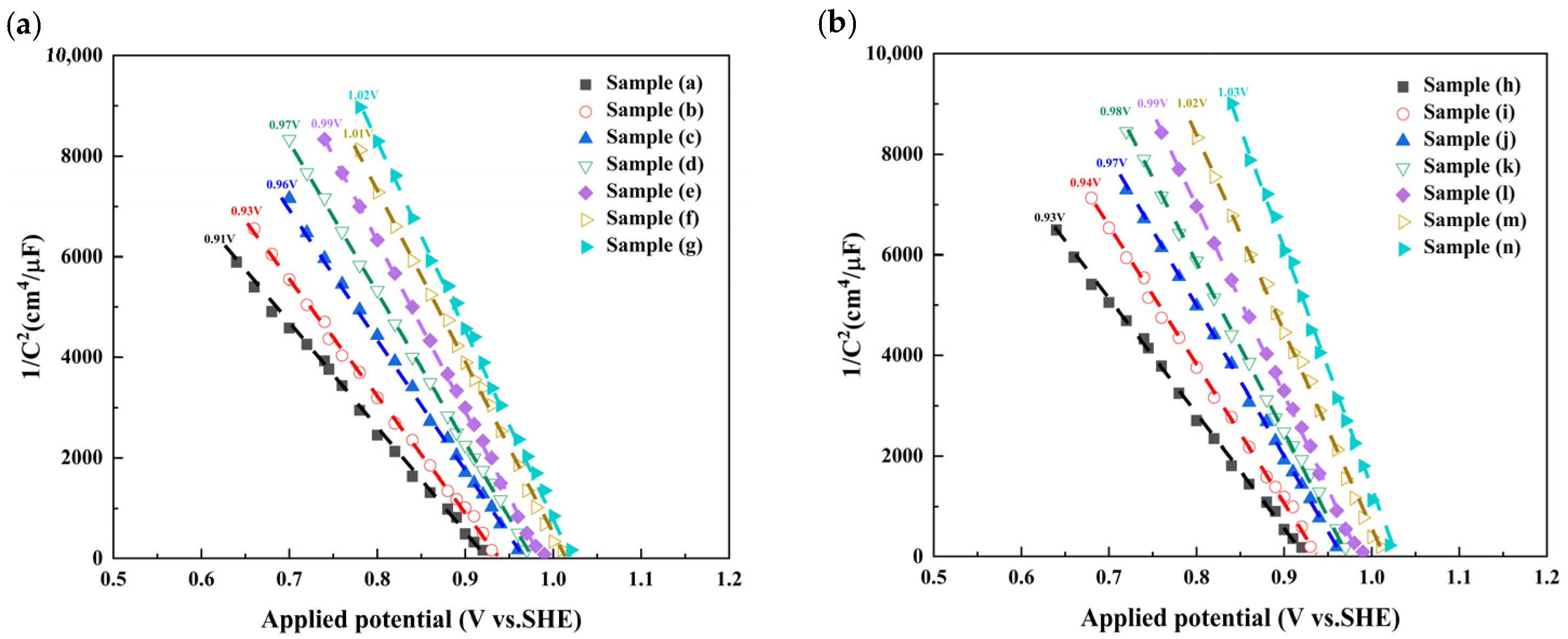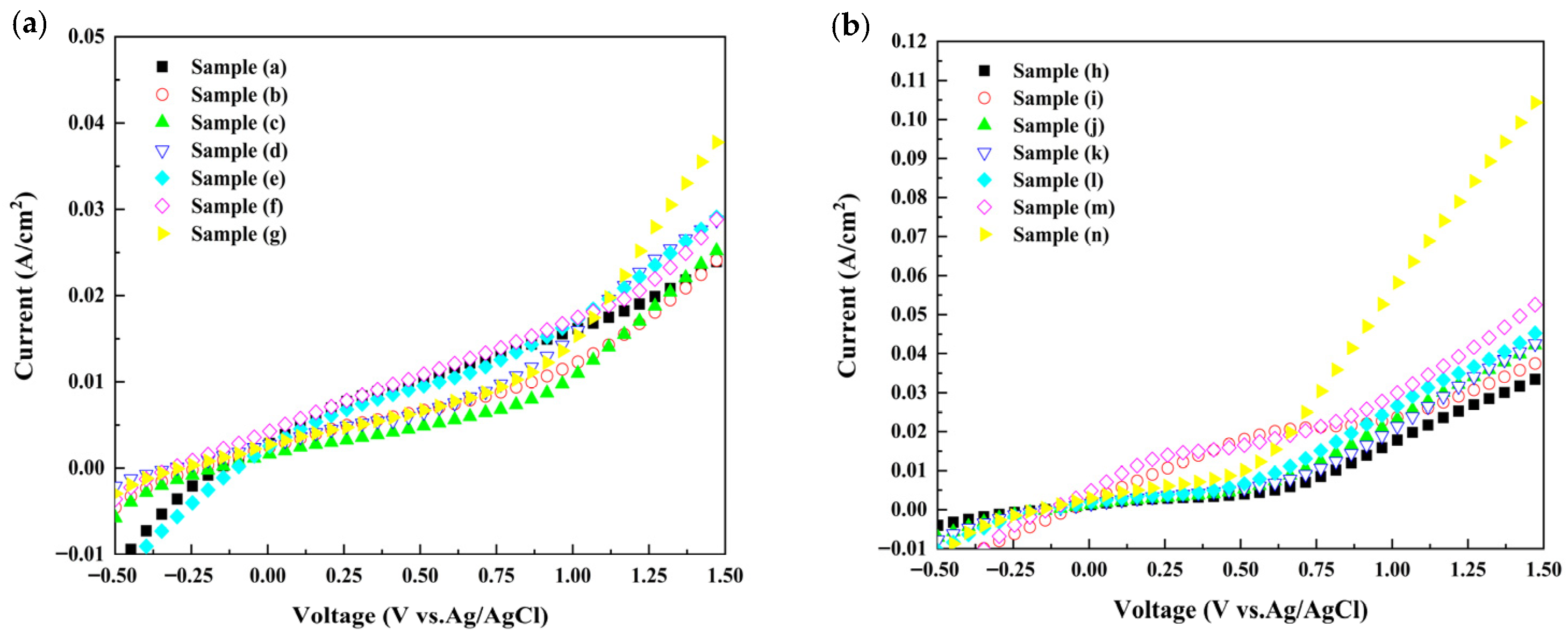 Figure 7b. Sample (n) delivers the highest current density among all electrodes under the same applied potential, which correlates well with its higher carrier density and more favorable flat-band position as listed in
