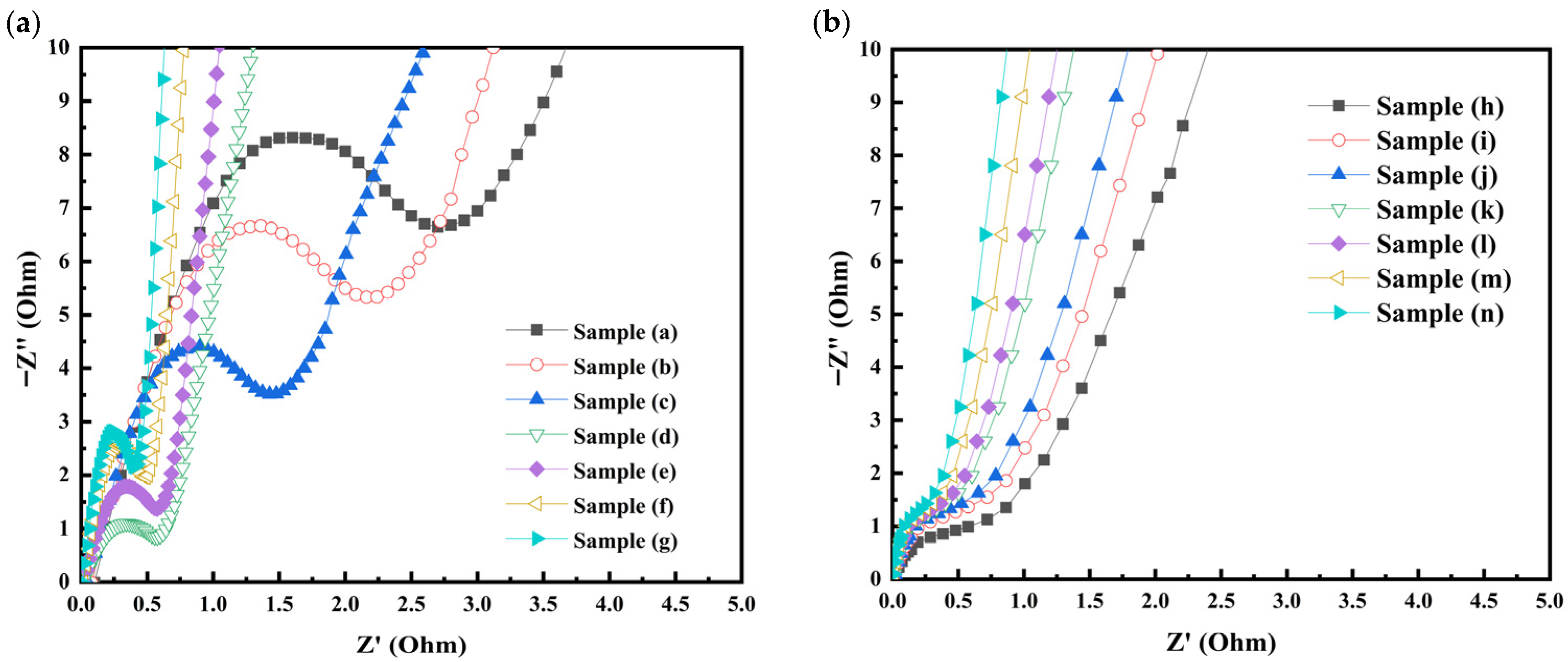 4 samples (a)–(g) exhibit Nyquist responses composed of a depressed semicircle in the high-frequency region and an inclined line in the low-frequency region, indicating the coexistence of interfacial charge transfer resistance and diffusion-controlled processes.