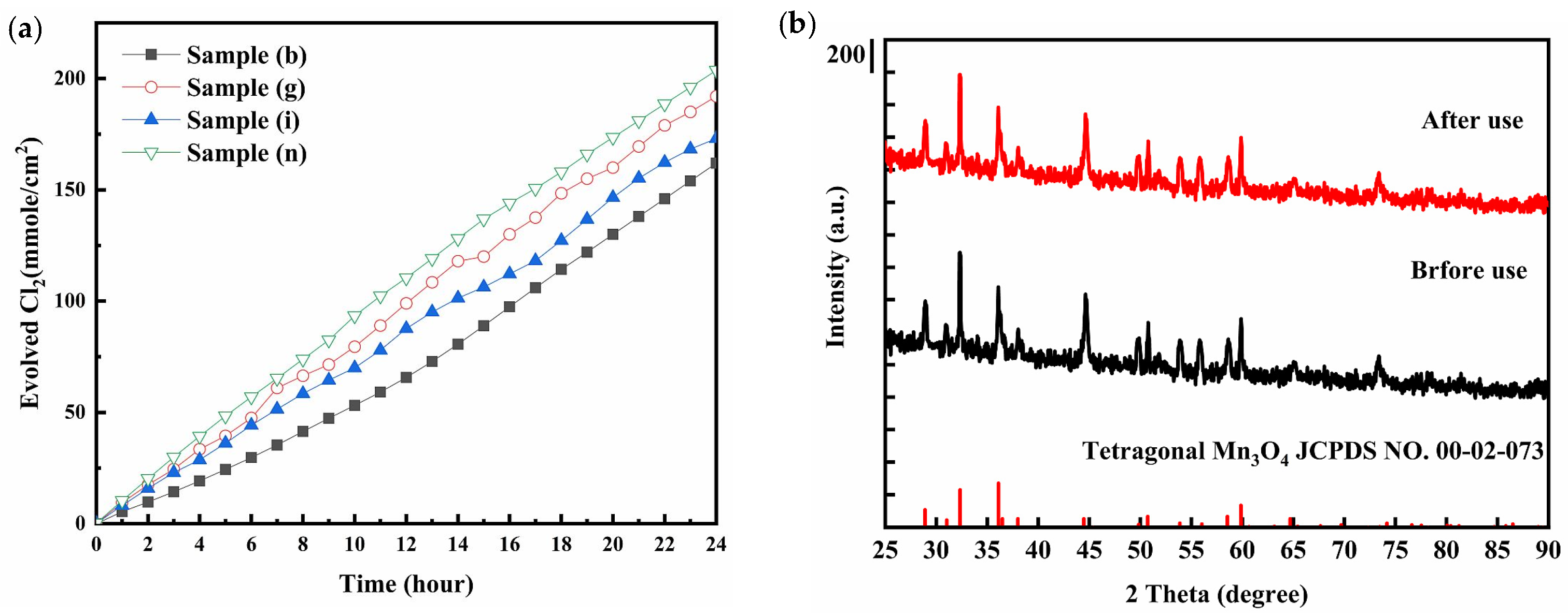 Furthermore, sample (n) maintained continuous chlorine evolution over 24 h and retained the characteristic tetragonal Mn3O4 crystalline phase after electrolysis, thereby providing preliminary evidence of short-term operational stability under chlorine evolution conditions. Although the present study demonstrates clear performance enhancement within the Mn3O4-based electrode series, dedicated long-term durability testing and post-test characterization are still required to verify the practical stability of the optimized Pt/Mn3O4 electrode for chlorine evolution applications.