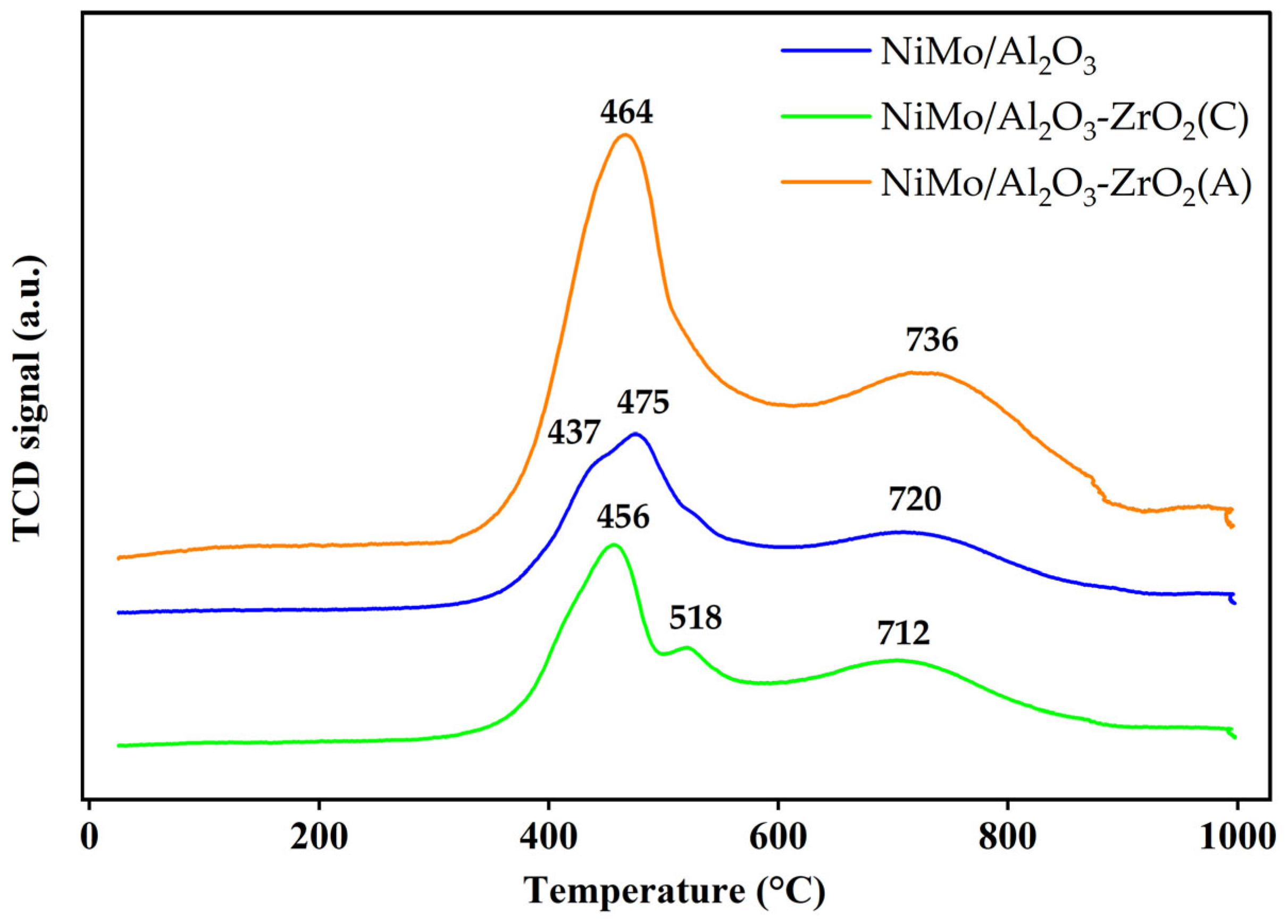 - Stanislaus, K.A.-D.Y.A. Temperature programmed reduction of SiO2–Al2O3 supported Ni, Mo and NiMo catalysts prepared with EDTA. Thermochim. Acta 2011, 520, 67–74. [Google Scholar] [CrossRef]