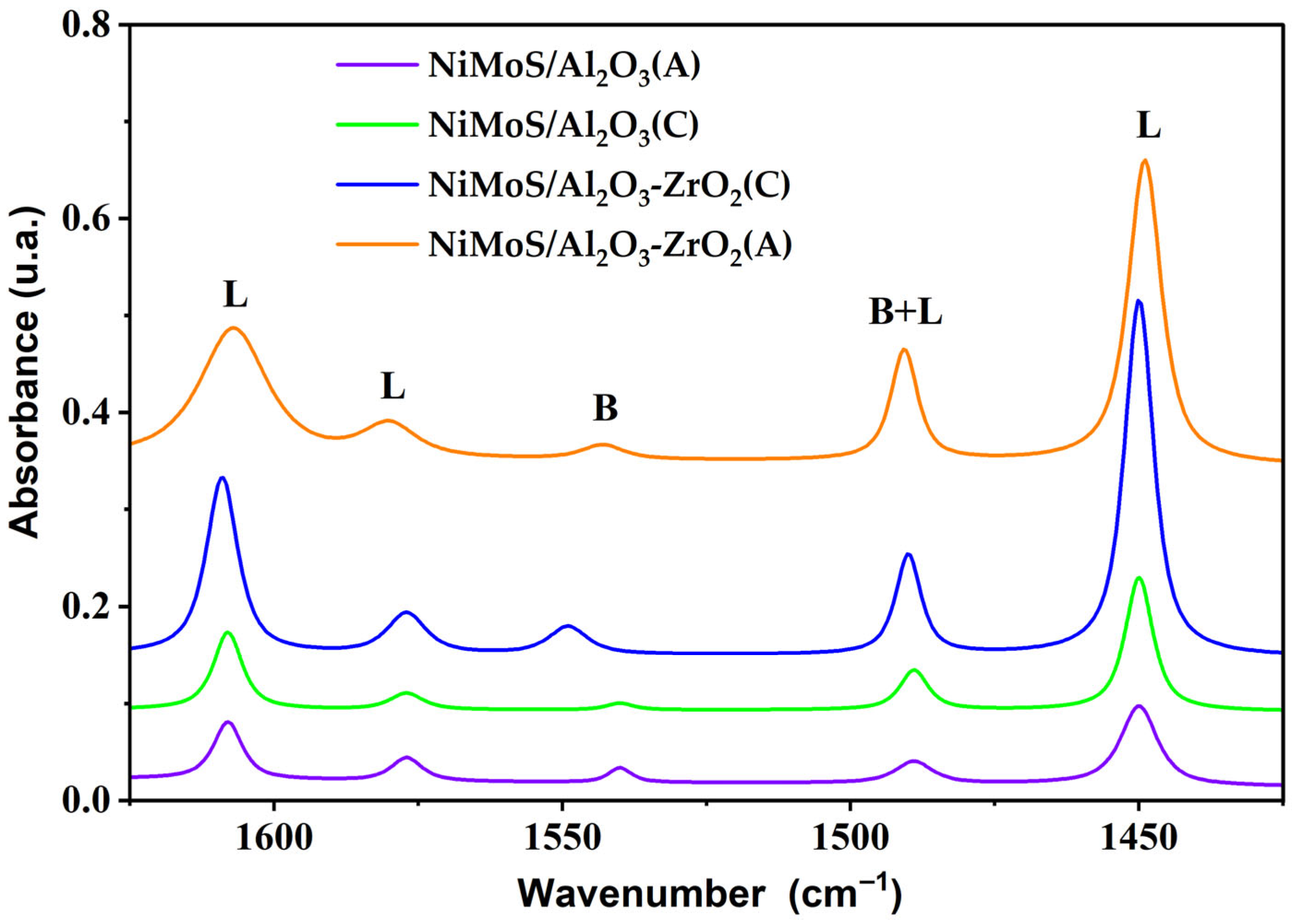 - Díaz-García, L.; Santes, V.; Viveros-García, T.; Sánchez-Trujillo, A.; Ramírez-Salgado, J.; Ornelas, C.; Rodríguez-Castellón, E. Electronic binding of sulfur sites into Al2O3-ZrO2 supports for NiMoS configuration and their application for Hydrodesulfurization. Catal. Today 2017, 282, 230–239. [Google Scholar] [CrossRef]