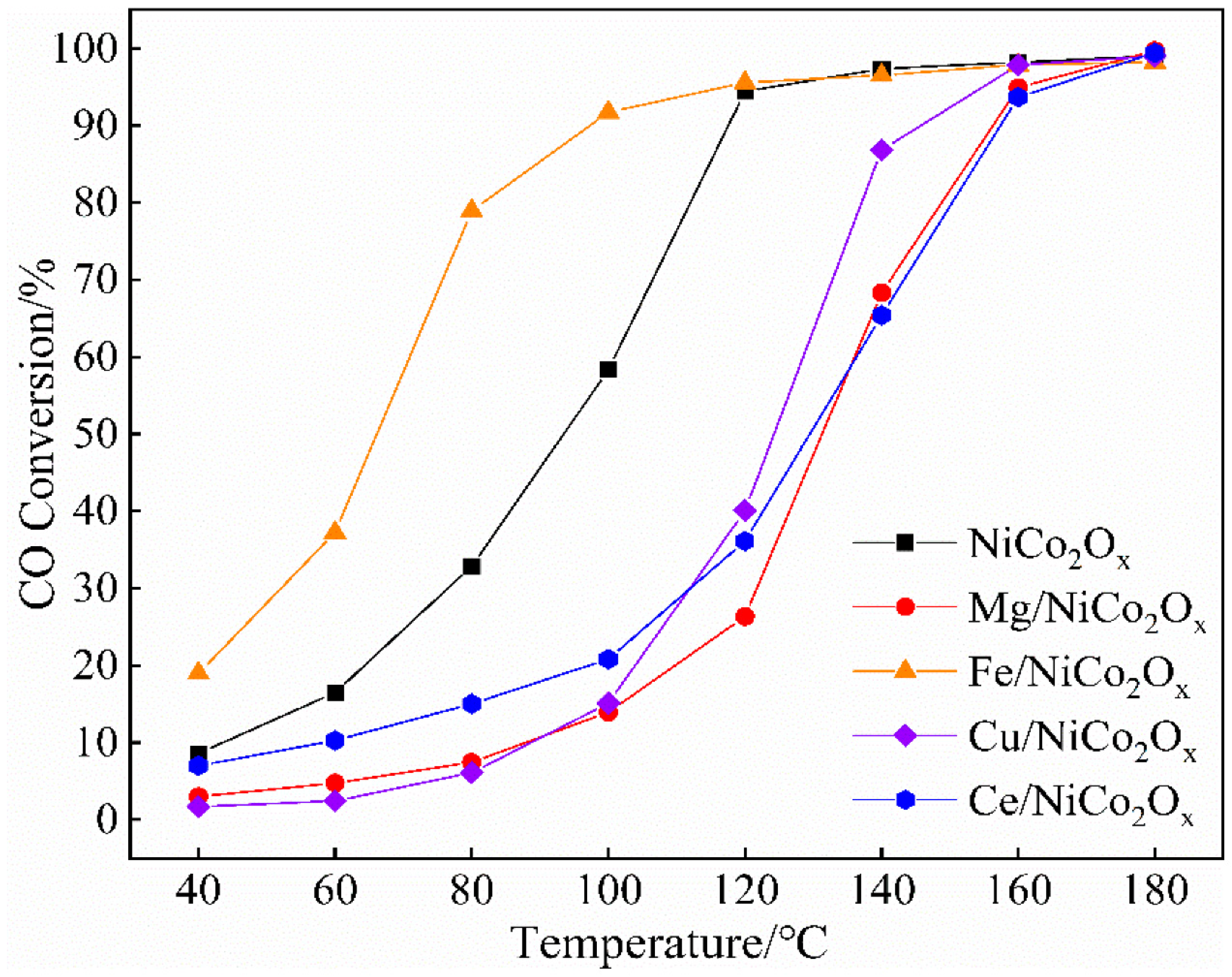 - Wang, J.; Chen, Z.; Cao, T.; Yang, J.; Kuang, Y.; Kang, J. The Effect of Adding Different Elements (Mg, Fe, Cu, and Ce) on the Properties of NiCo2OX for CO-Catalyzed Oxidation. Materials 2025, 18, 2554. [Google Scholar] [CrossRef] [PubMed]