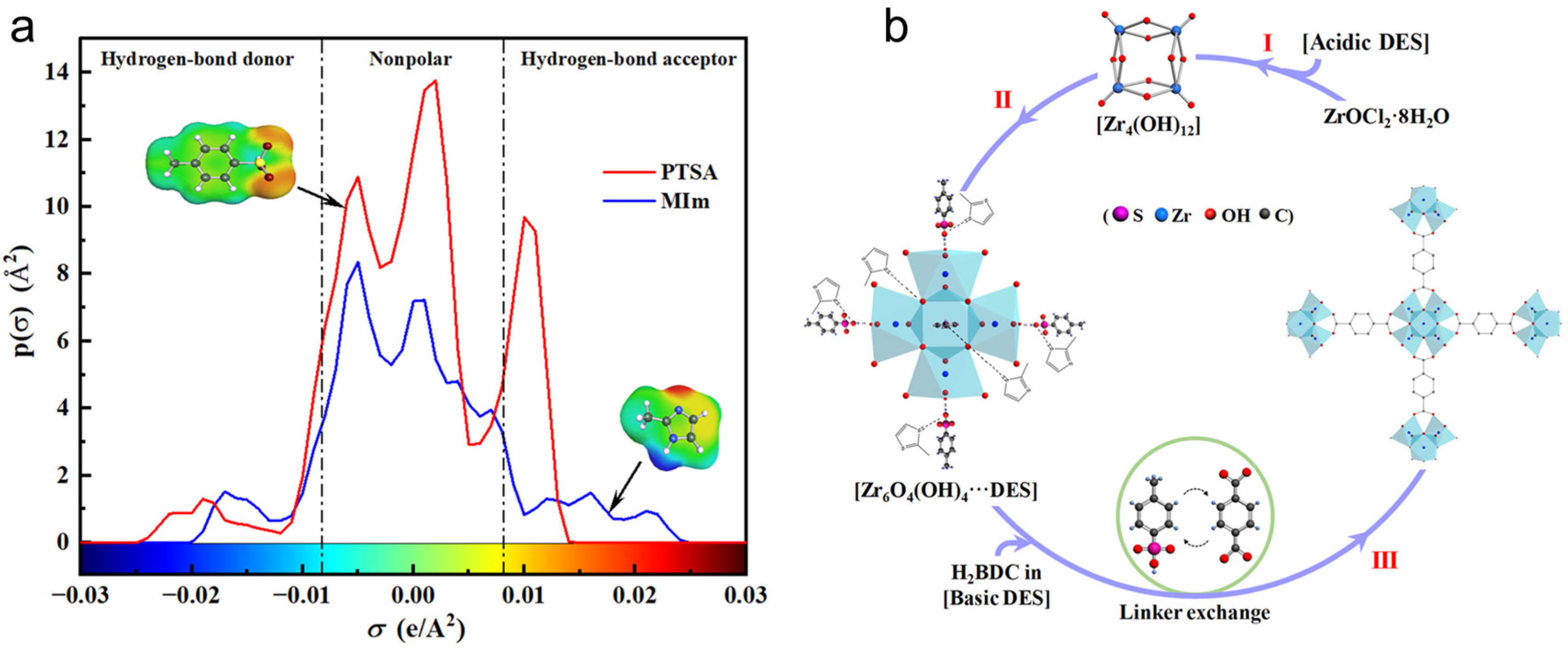 - Chen, L.; Ye, X.; Zhang, T.; Qin, H.; Cheng, H.; Qi, Z. Fast assembly of metal organic framework UiO-66 in acid-base tunable deep eutectic solvent for the acetalization of benzaldehyde and methanol. Molecules 2022, 27, 7246. [Google Scholar] [CrossRef] [PubMed]