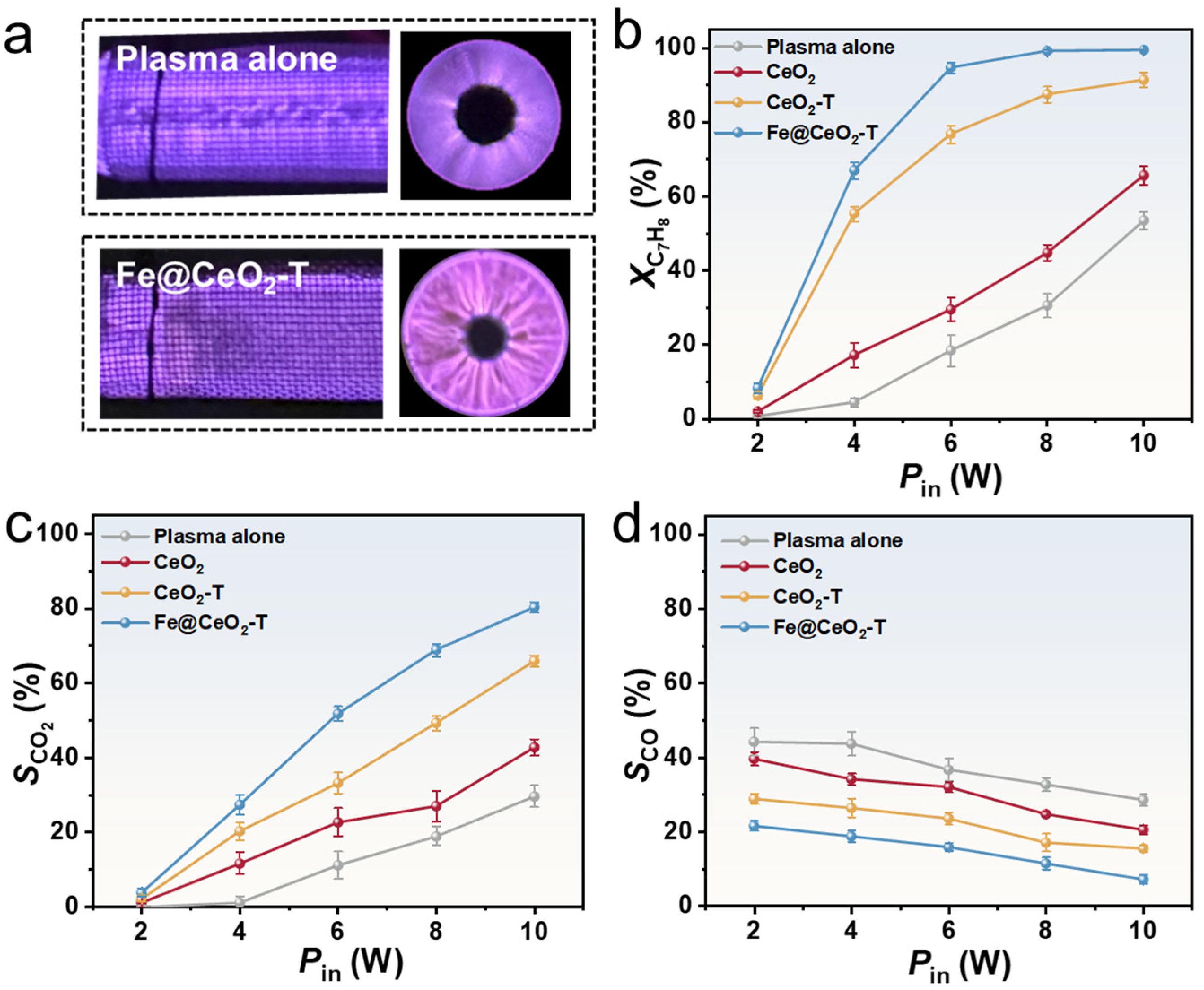 - Wang, C.; Xu, T.; Xu, H.; Yuan, Y.; Gu, Q.; Zhang, X.; Zhu, B. Synergistic plasma-catalysis over porous Fe-doped CeO2 for the enhanced removal of toluene. Chem. Eng. J. 2026, 531, 174346. [Google Scholar] [CrossRef]